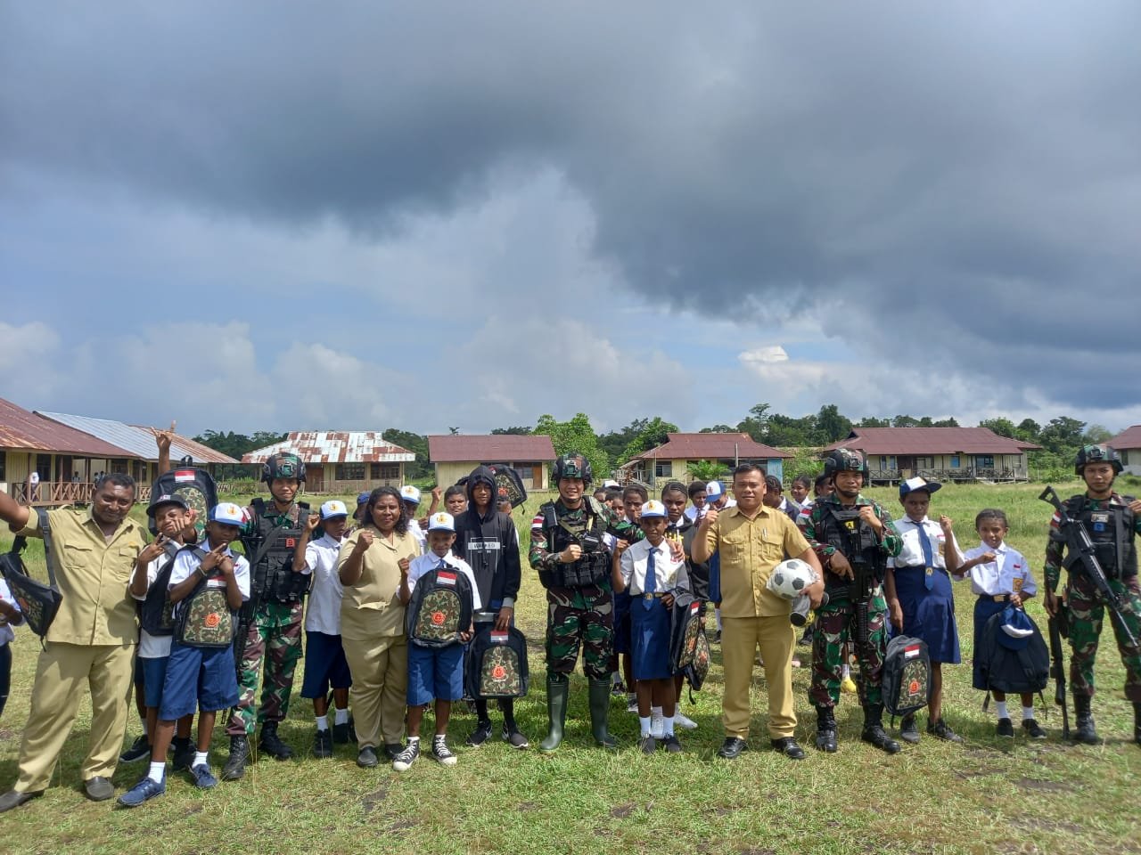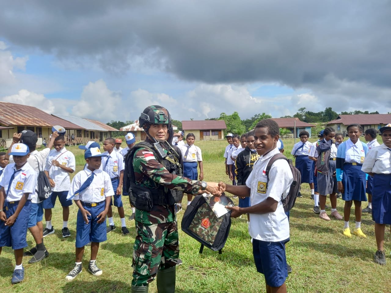 Meningkatkan semangat dan motivasi belajar anak-anak di wilayah perbatasan RI-PNG, Dansatgas Yonif 126/KC Letkol Inf Dwi Widodo, SH, M.Han membagikan perlengkapan sekolah dan sarana olahraga kepada siswa-siswi SMP Negeri 1 Senggi, Kabupaten Keerom.