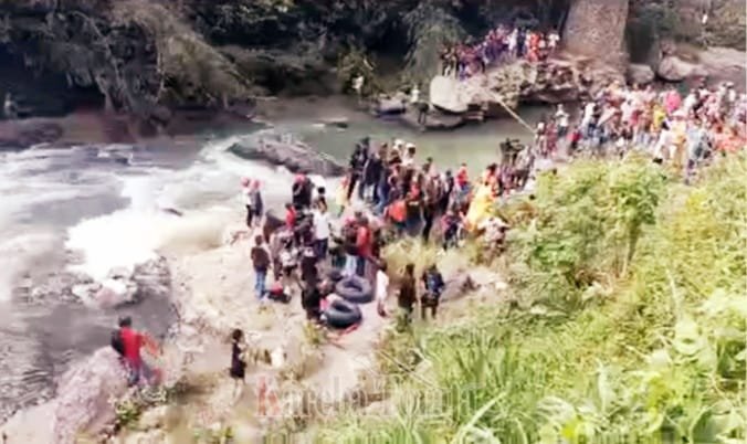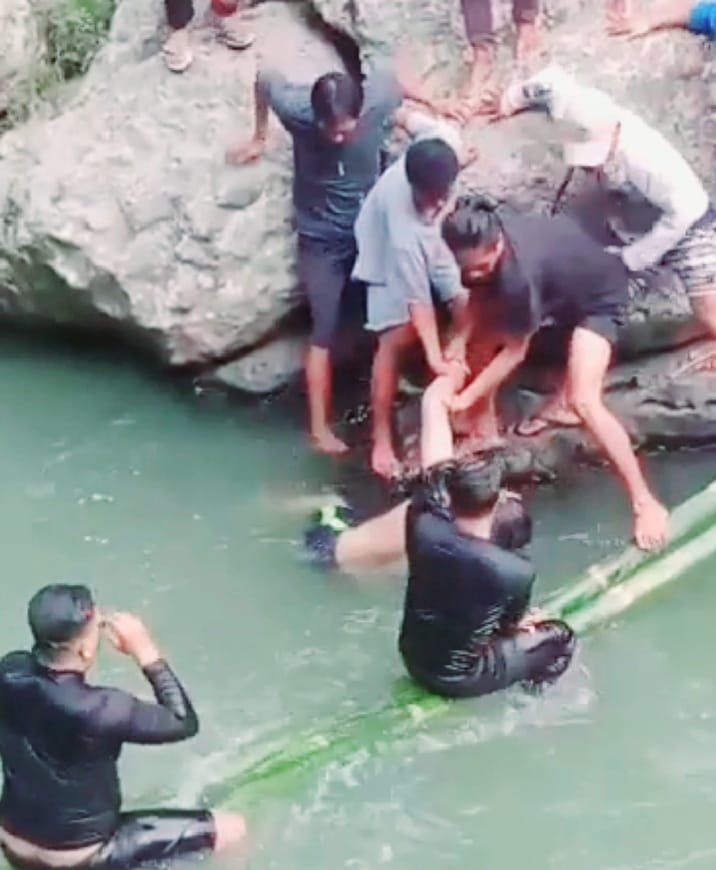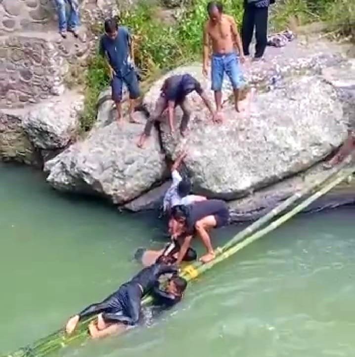 di bawah jembatan di lubang sela-sela batu besar kurang lebih 100 meter dari lokasi kejadian karena terbawa arus sungai deras.