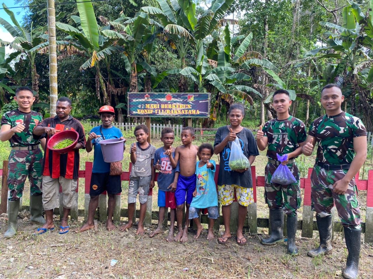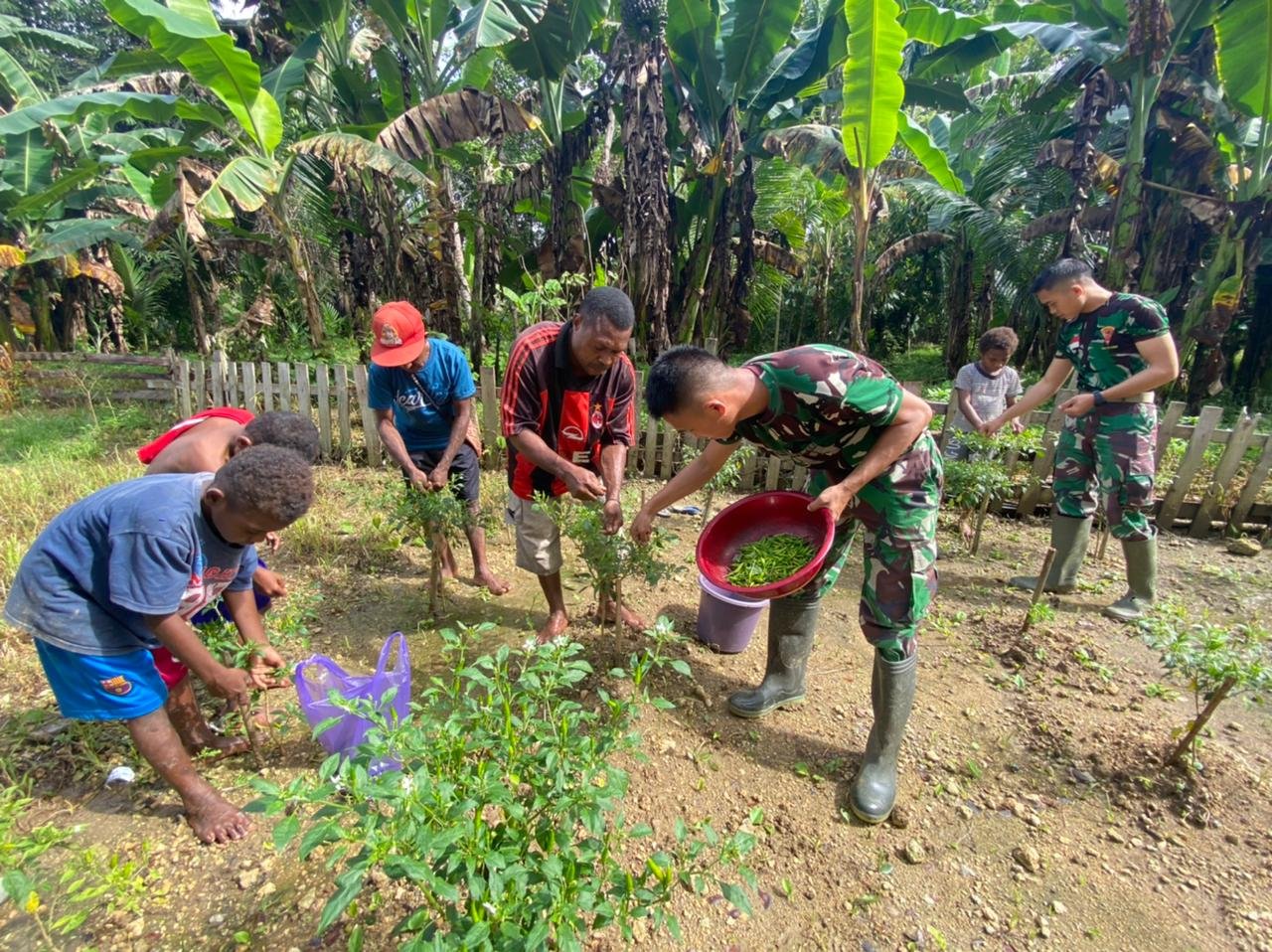 Seperti yang dilakukan personel Pos Arso Kota, beberapa bulan lalu menaman cabai, kini musim panen tiba dan hasilnya cukup melimpah, kemudian dibagikan kepada warga.