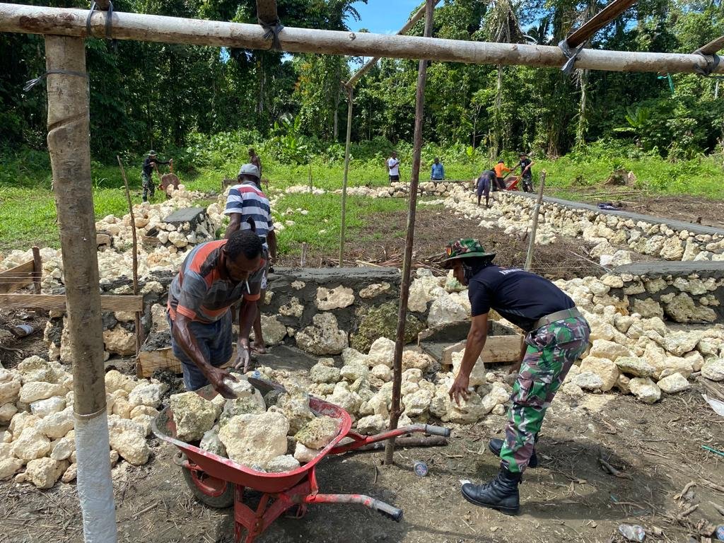 Sebagai bentuk kepedulian terhadap sarana tempat ibadah di Papua, Satgas Pamtas RI-PNG Yonif 711Rks Brigif 22/OM Pos Wambes melaksanakan kerja bakti bersama warga Kampung Suskun, Distrik Arso Timur, Kabupaten Keerom, Papua, Senin (02/08/2022).
