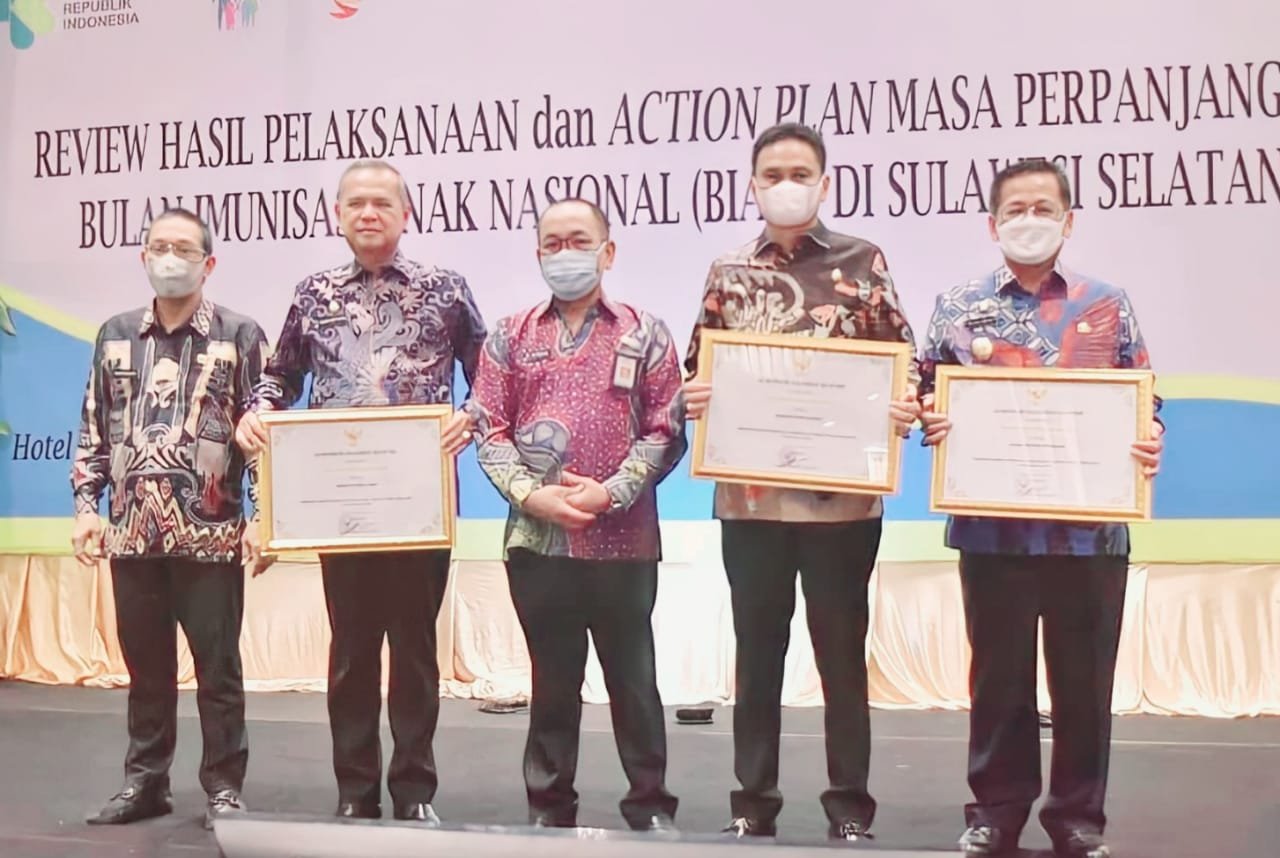 Penghargaan ini diserahkan oleh dr Iksan Mustari, Asisten Perekonomian dan Pembangunan Pemprov Sulsel yang diterima langsung Wakil Bupati Pinrang, H Alimin pada acara Review Hasil Pelaksanaan dan Action Plan Masa Perpanjangan Bulan Imunisasi Anak Nasional (BIAN) di Sulawesi Selatan yang digelar Pemprov Sulsel, Kamis (11/08/2022) di Makassar.