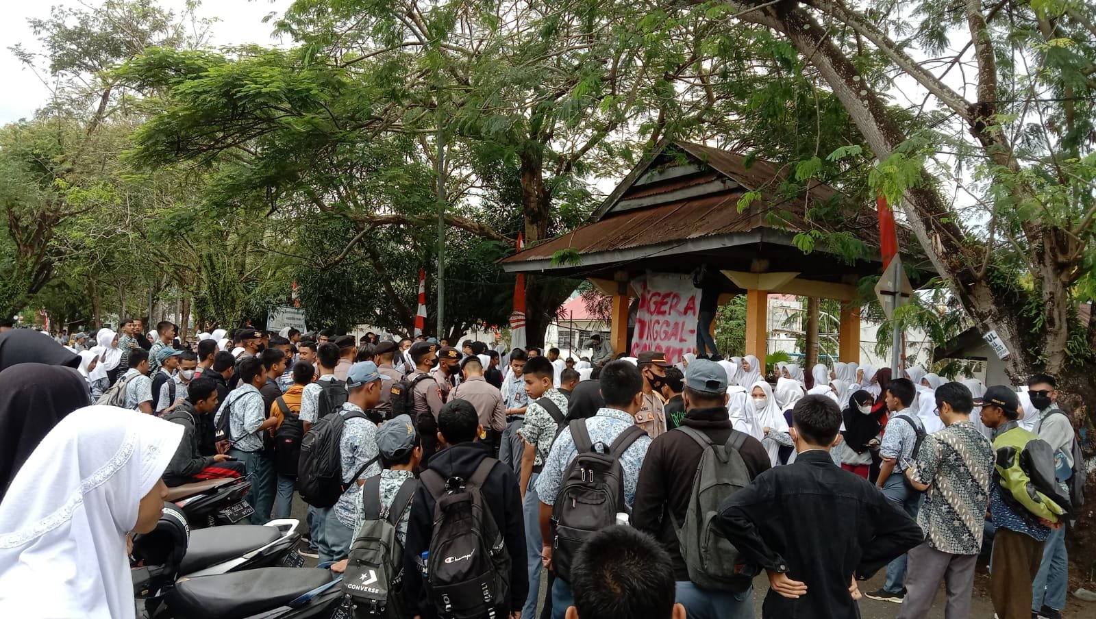 "Kami tidak setuju dengan kebijakan Kepala Sekolah yang menerima pelaku kriminal di sekolah kita. Padahal mereka semua itu diberhentikan oleh sekolah lain. Kenapa kita menerimanya ?," teriak salah seorang siswa dengan menggunakan pengeras suara.