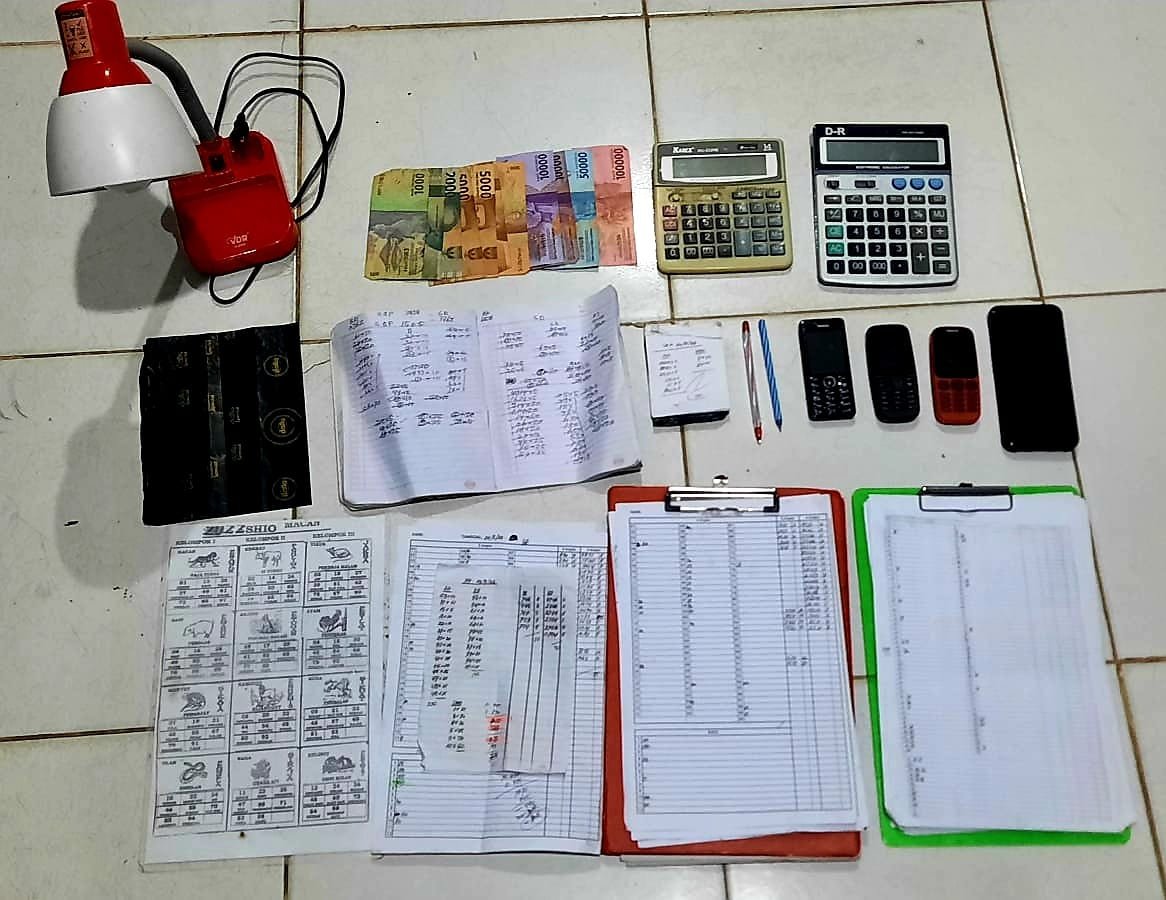 Dari tangan ketiga terduga pelaku, polisi berhasil mengamankan dan menyita sejumlah barang bukti penunjang menjalankan aksi berupa 4 unit HP berbagai merek, 1 lembar tabel nomor dan shio, 12 lembar tabel rekapan shio dan nomor, 1 buah buku kecil untuk menulis nomor dan shio, 2 lembar kertas karbon, 2 buah pulpen, 2 buah kalkulator, serta uang tunai total Rp 195.000,-.