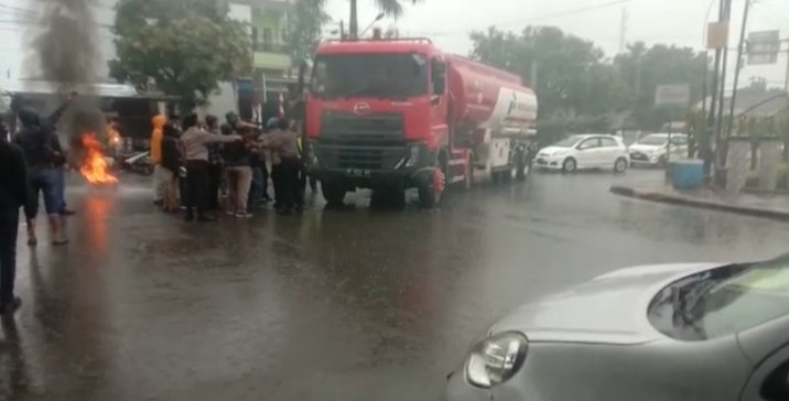 Aksi HMI sempat diwarnai ketegangan saat mahasiswa berusaha menghadang sebuah mobil tangki yang sedang melintas untuk dijadikan panggung orasi.