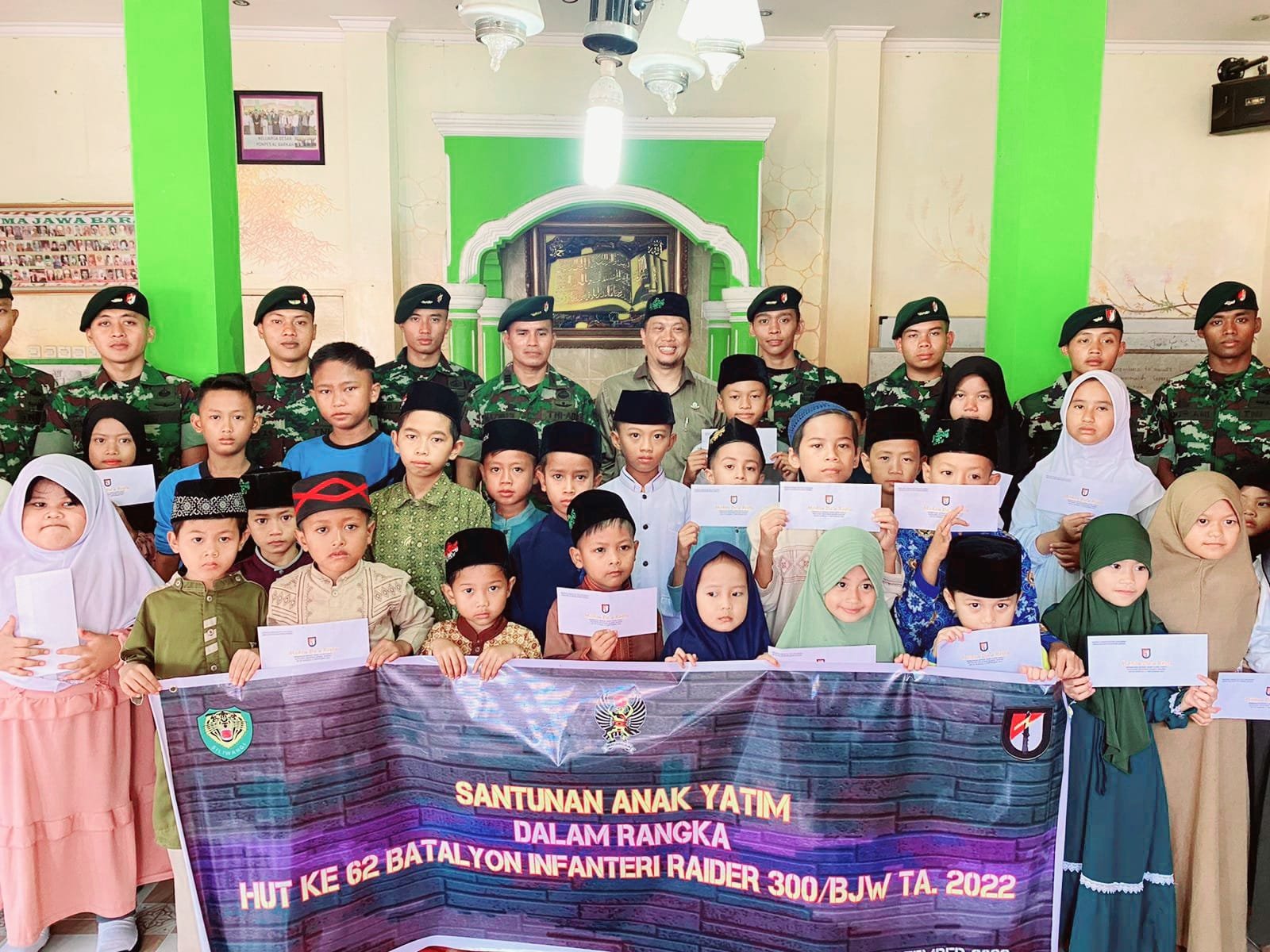 Peringatan HUT ke-62 tanggal 17 September 2022 Yonif Raider 300/Brajawijaya digelar di Mayonif Raider 300/Brajawijaya yang berlangsung sederhana dengan melibatkan seluruh personel, Persit Kartika Chandra Kirana Cabang XLIII PD III/Slw, warga desa binaan dan anak yatim piatu Pondok Pesantren Al Barkah Kabupaten Cianjur.