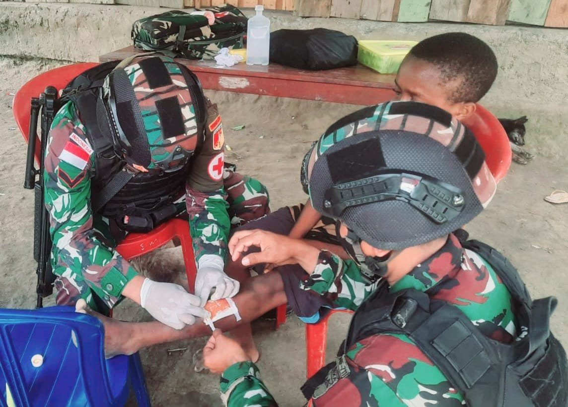 Dalam memberikan pelayanan kesehatan kepada masyarakat di wilayah Papua, tim kesehatan Satgas Pamtas RI-PNG Yonif 711/Rks Brigif 22/OM melalui Pos Ampas gerak cepat bantu mengobati anak-anak yang sedang terluka di Kampung Ampas, Distrik Arso Timur, Kabupaten Keerom, Papua, Sabtu (17/09/2022).