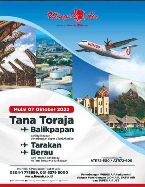 Rencana Jumat (23/09/2022) besok penerbangan perdana rute baru Balikpapapan-Toraja Airport, dilayani Maskapai Wings Air dari Lion Group, dengan pesawat ATR.72-600, batal dan ditunda ke tanggal 7 Oktober 2022.