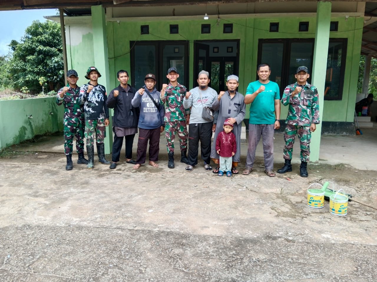Personel Pos Sei Tengah Satgas Pamtas RI-MLY Yonif 645/Gty dipimpin Serda Efrin beserta 5 (lima) orang anggota bahu membahu bersama warga masyarakat melaksanakan kegiatan Karya Bakti melakukan pengecatan Mushola Darul Iman, Dusun Sungai Tengah, Kecamatan Paloh, Kabupaten Sambas, Provinsi Kalimantan Barat.