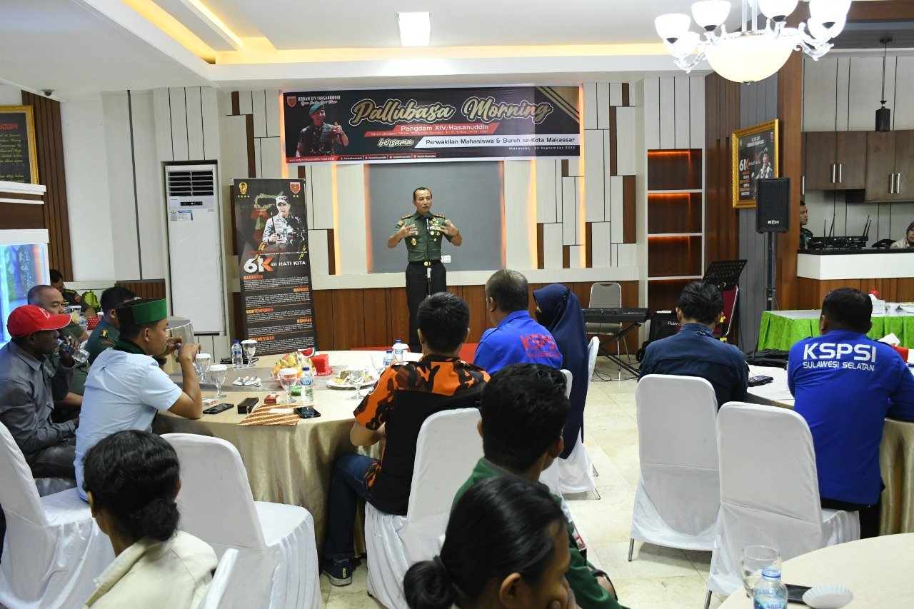 Pangdam XIV/Hasanuddin Mayjen TNI Dr. Totok Imam Santoso, SIP, S.Sos, M.Tr(Han) melaksanakan "Pallubasa Morning" dengan perwakilan mahasiswa dan buruh se-Kota Makassar dan Sulsel bertempat di ruang kehormatan Makodam, Jl. Urip Sumoharjo, Kamis (22/09/2022).