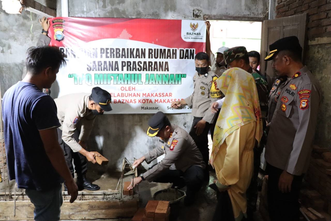 Kapolres Pelabuhan Makassar AKBP Yudi Frianto, SIK, MH melakukan peletakan batu pertama pembangunan Rumah Tahfiz Al-Qur'an TPQ Miftahul Jannah yang bekerjasama dengan Baznas Makassar, Jumat (23/09/2022).