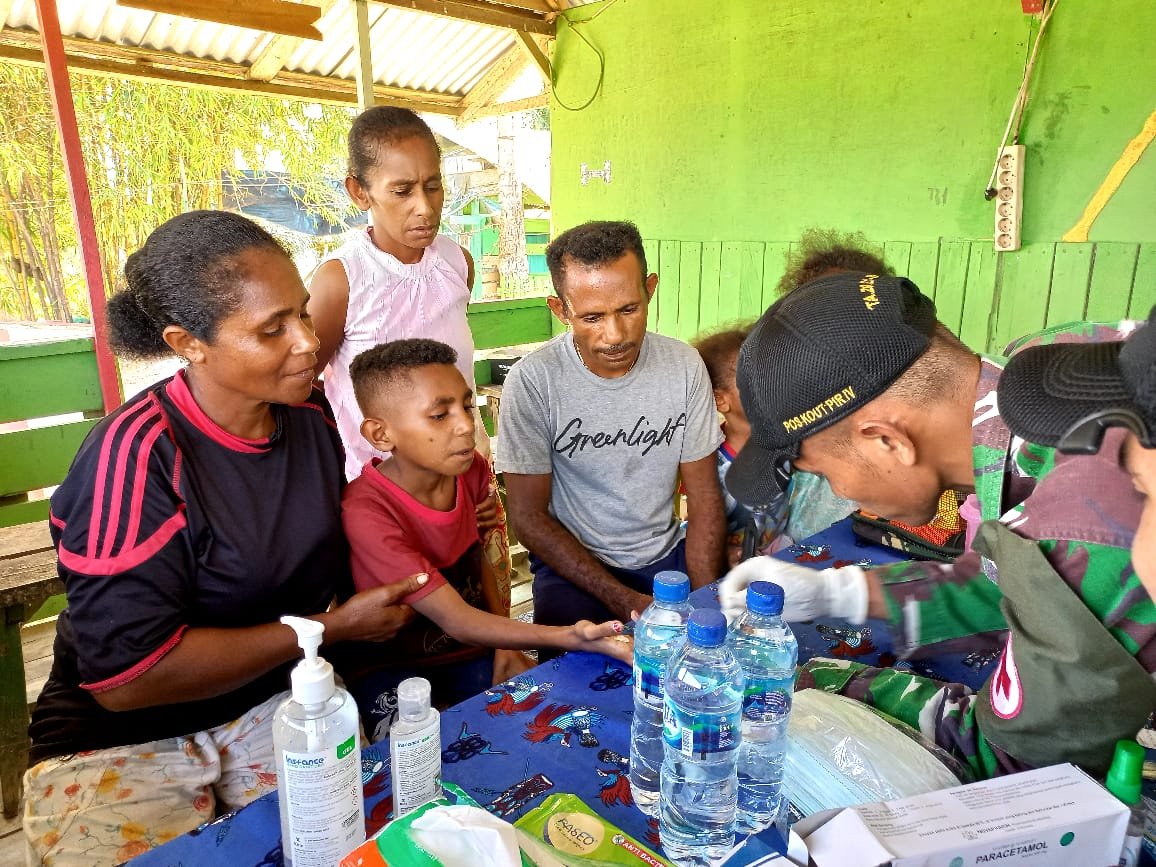 Wujudkan kepedulian Satgas terhadap kesehatan masyarakat di perbatasan, Satgas Pamtas RI-PNG Yonif 711/Rks Brigif 22/OM Pos Skamto menggelar pengobatan untuk masyarakat, bertempat di Pos Skamto di Desa Yowong, Distrik Arso Timur, Kabupaten Keerom, Papua, Kamis (22/09/2022).