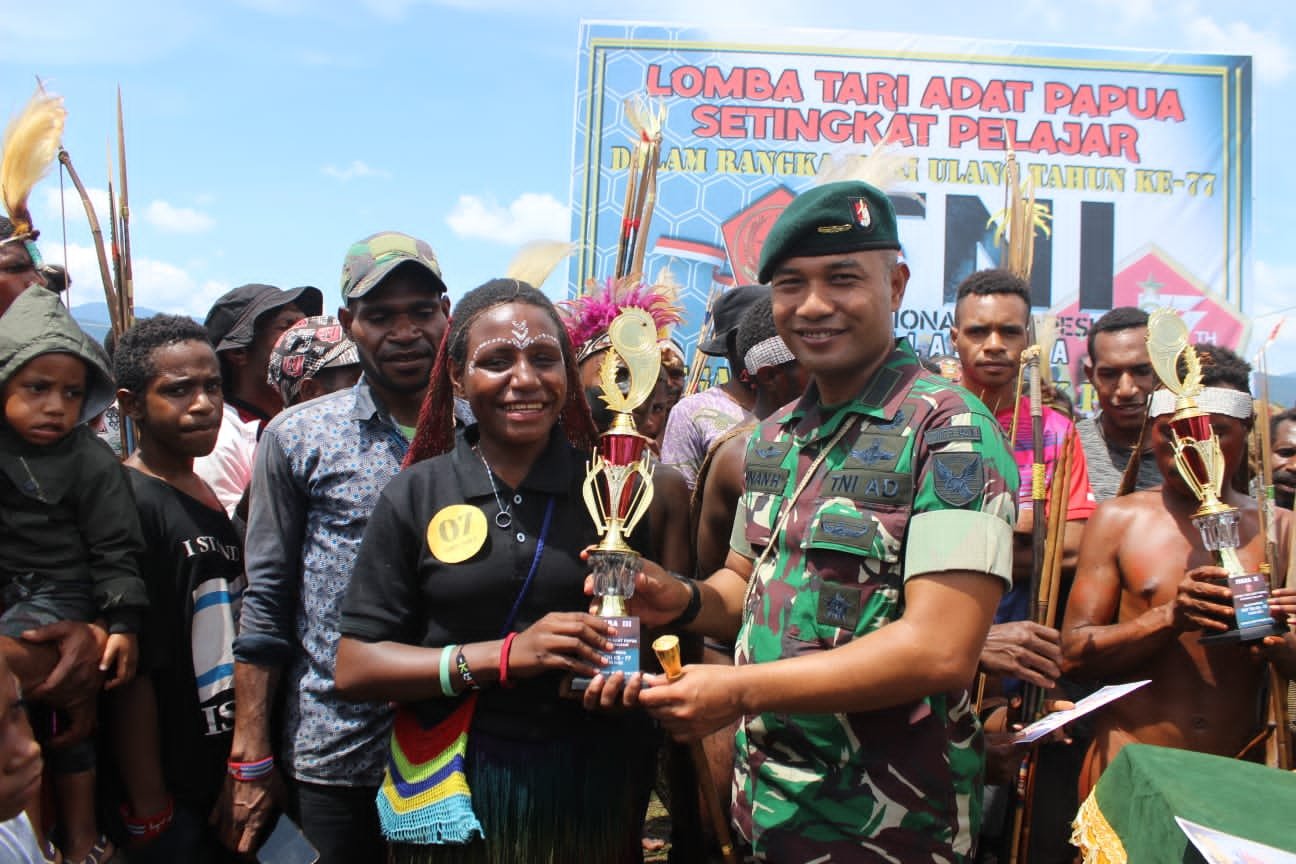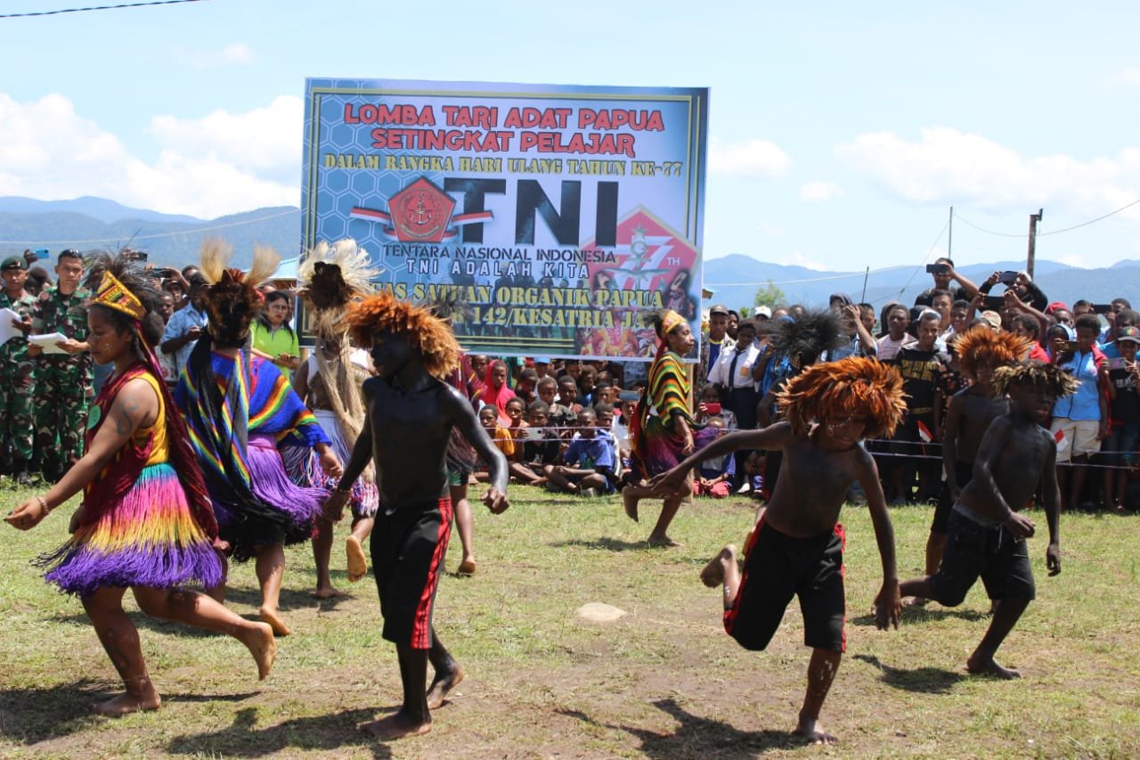 Pada kesempatan itu, Dansatgas Pamtas Yonif Raider 142/KJ Letkol Inf Esnan Haryadi memimpin langsung pembukaan Lomba Tari Adat Papua setingkat pelajar. “Kita TNI pada hari ini berulang tahun ke-77, dengan Tema TNI Adalah Kita, dimana hari ini juga kita mengadakan perlombaan tari adat Papua tingkat pelajar yang diikuti oleh 25 tim dari SMA, SMP dan SD yang berada di Distrik Elelim,” jelasnya.