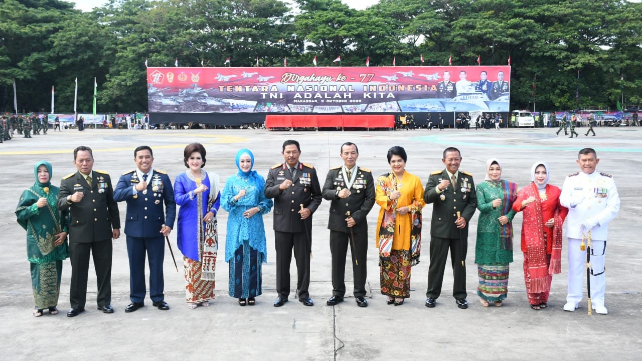 Puncak Peringatan Hari Ulang Tahun (HUT) ke-77 TNI, 5 Oktober 2022, dipusatkan di Lapangan Karebosi Jl. Ahmad Yani Kota Makassar, dengan Inspektur Upacara (Irup) Pangdam XIV/Hasanuddin Mayjen TNI Dr. Totok Imam Santoso, SIP, S.Sos, M.Tr(Han), Rabu (05/10/2022).