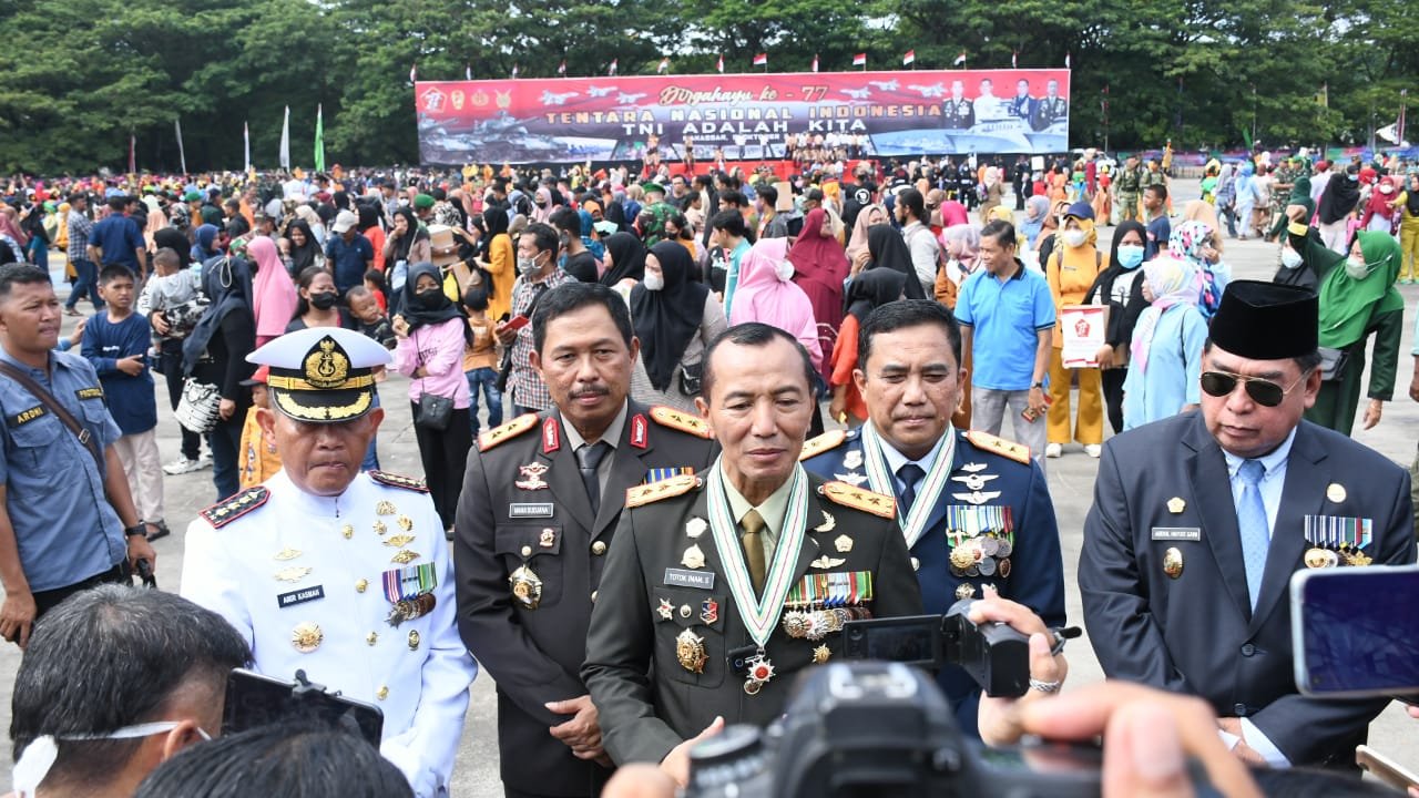 Peringatan HUT Ke-77 TNI tersebut, diikuti ribuan personel gabungan TNI (TNI AD, TNI AU, TNI AL dan PNS TNI) serta pasukan Komponen Cadangan (Komcad) dengan mengusung tema yaitu “TNI ADALAH KITA”.