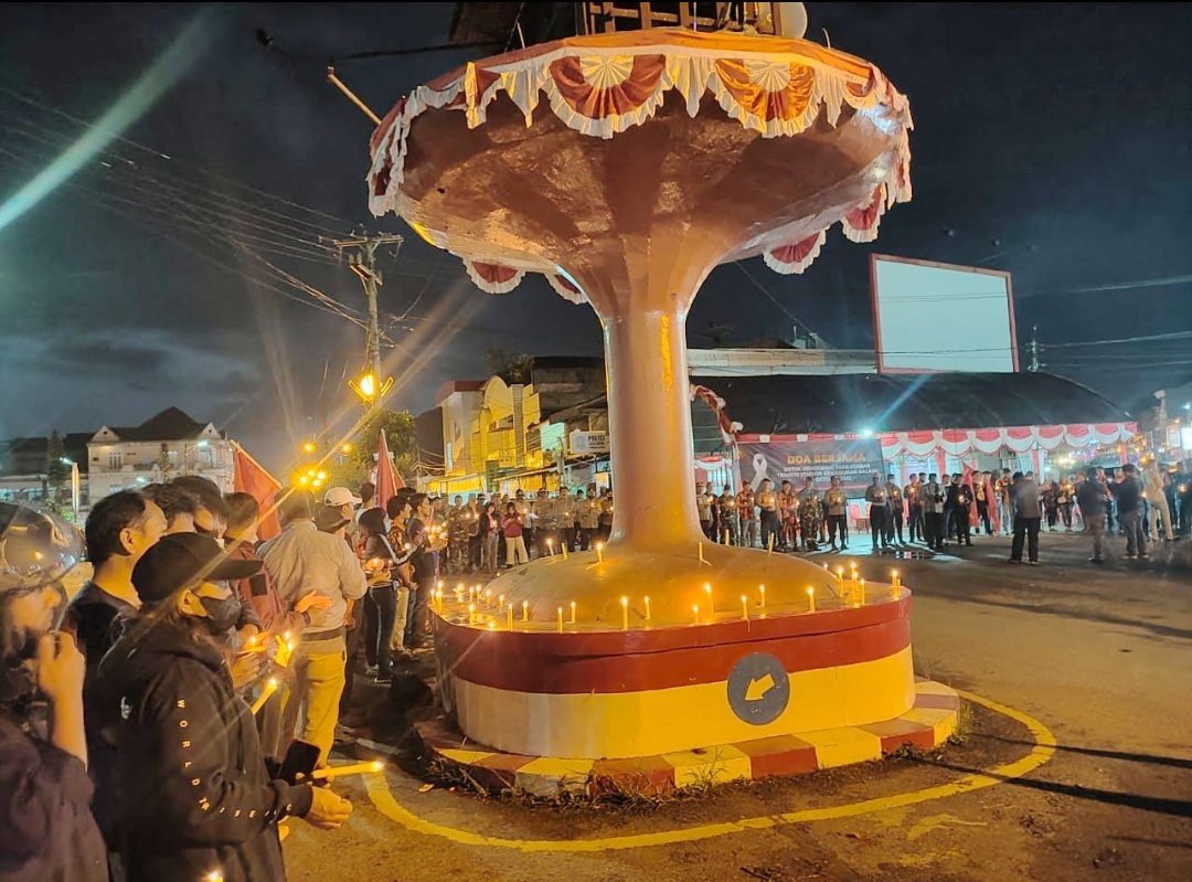 Doa bersama dilakukan dengan aksi bakar lilin yang diselenggarakan di Bundaran Kandean Dulang, Kecamatan Rantepao, Kabupaten Toraja Utara.