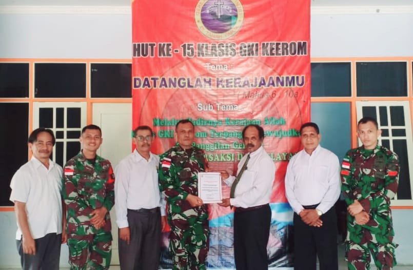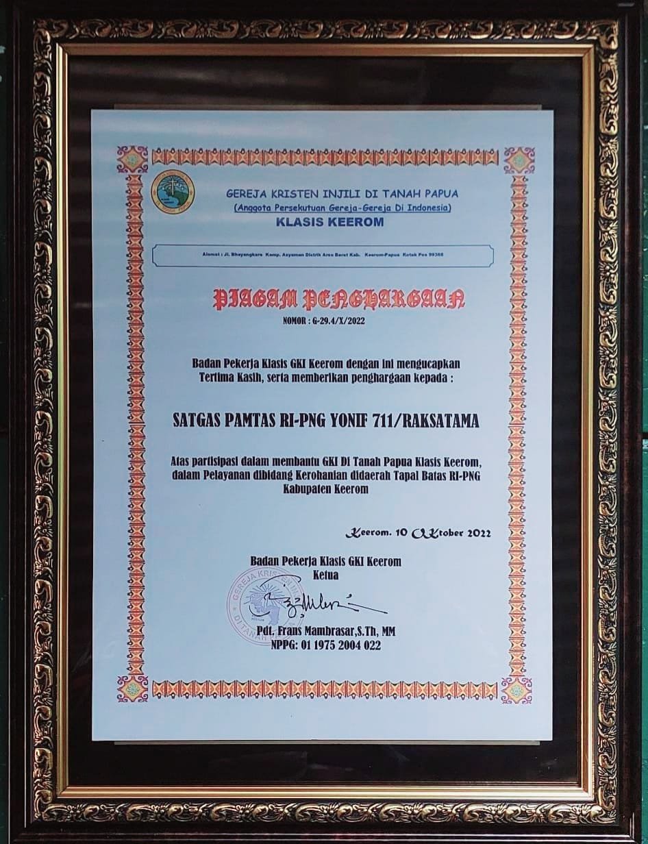 Wujud toleransi umat beragama dan telah berpartisipasi membantu masyarakat di perbatasan RI-PNG khususnya di Kabupaten Keerom, Satgas Pamtas RI-PNG Yonif 711/Rks Brigif 22/OM terima penghargaan dari Ketua Klasis GKI Kabupaten Keerom, Pendeta Frans Mambrasar, S.Th, MM di GKI Klasis, Distrik Arso, Kabupaten Keerom, Papua, Rabu (12/10/2022).
