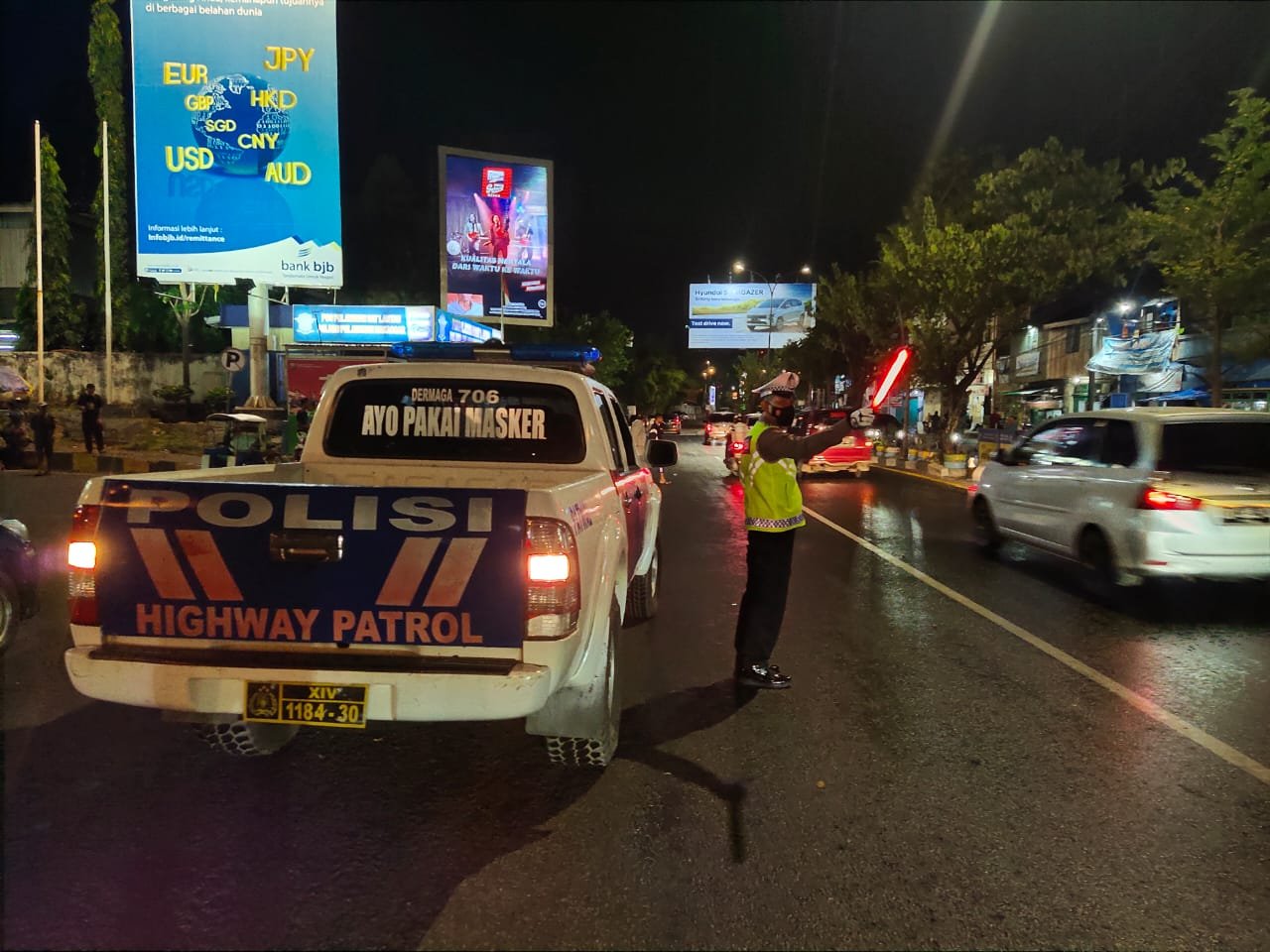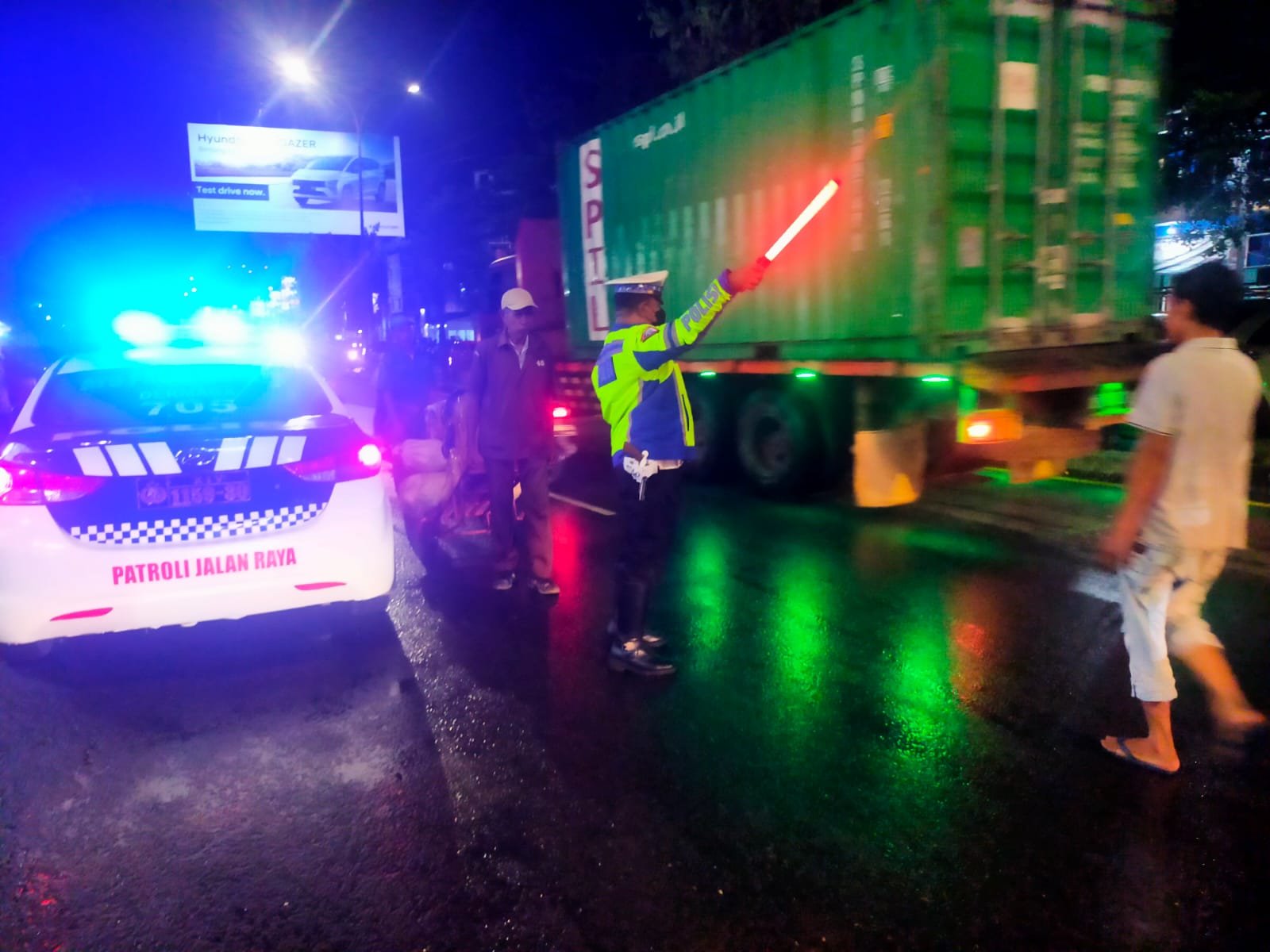Pengaturan lalu lintas tidak hanya dilakukan pagi dan sore hari. Personel Satlantas Polres Pelabuhan Makassar juga rutin melakukan pengaturan di malam hari.