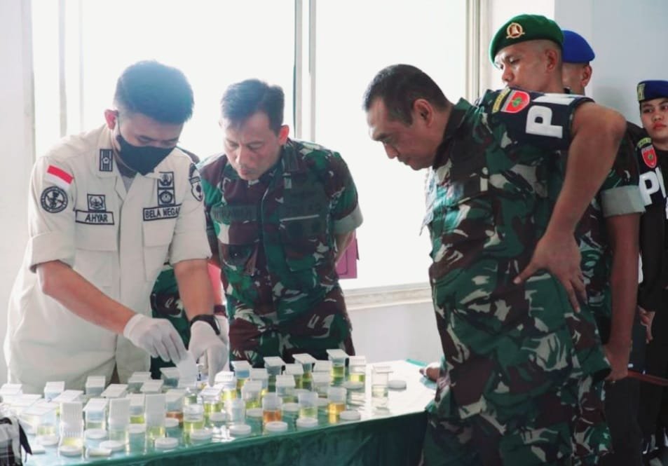 Perangi Narkoba, Kodam XIV/Hasanuddin sidak Pejabat Utama (PJU), Prajurit dan PNSnya lakukan tes urine narkotika dan psikotropika, bertempat di Makodam XIV/Hasanuddin, Kota Makassar, Senin (24/10/2022).
