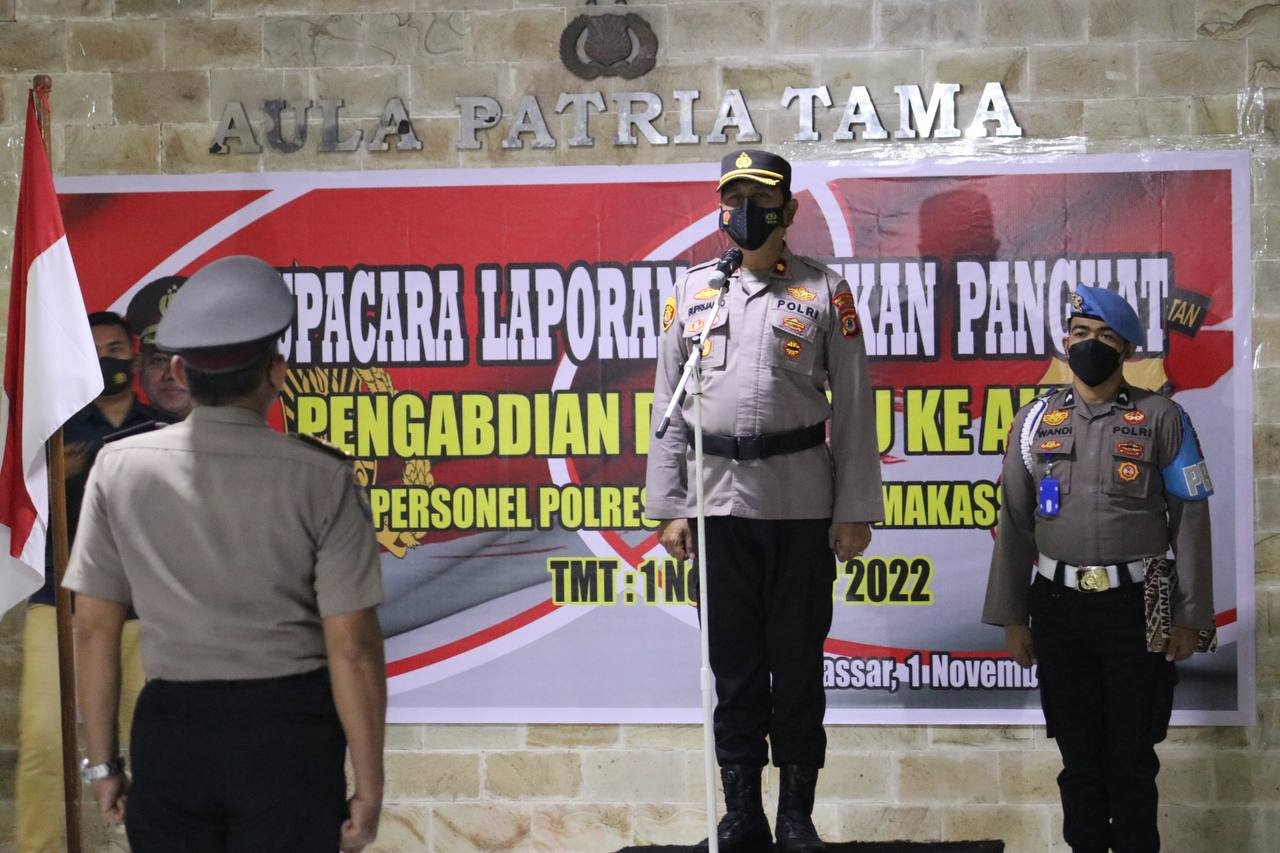Wakapolres Pelabuhan Makassar Kompol Sugeng Suprijanto, S.Pd, MH memimpin upacara Korps Rapor kenaikan pangkat pengabdian di Aula Patria Tama Mapolres tersebut, Selasa (01/11/2022).