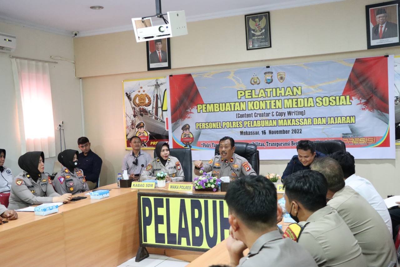 Untuk mempelajari lebih dalam terkait media sosial, Bagian SDM Polres Pelabuhan Makassar menggelar Pelatihan Pembuatan Konten Media Sosial (Conten Creator dan Copy Writing), Rabu (16/11/2022).