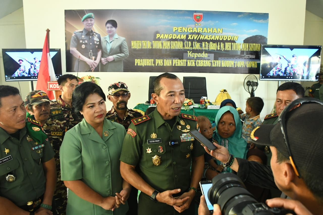 Pangdam XIV Hasanuddin Mayjen TNI Dr. Totok Imam Santoso, SIP, S.Sos, M.Tr (Han), didampingi Ketua Persit Kartika Chandra Kirana Daerah XIV Hasanuddin Ny. Desi Totok Imam beserta sejumlah Pejabat Utama Kodam XIV/Hasanuddin melaksanakan Kunjungan Kerja (Kunker) sekaligus bersilatuhrahmi dan tatap muka dengan para personel Kodim 1409/Gowa, Kamis (17/11/2022).