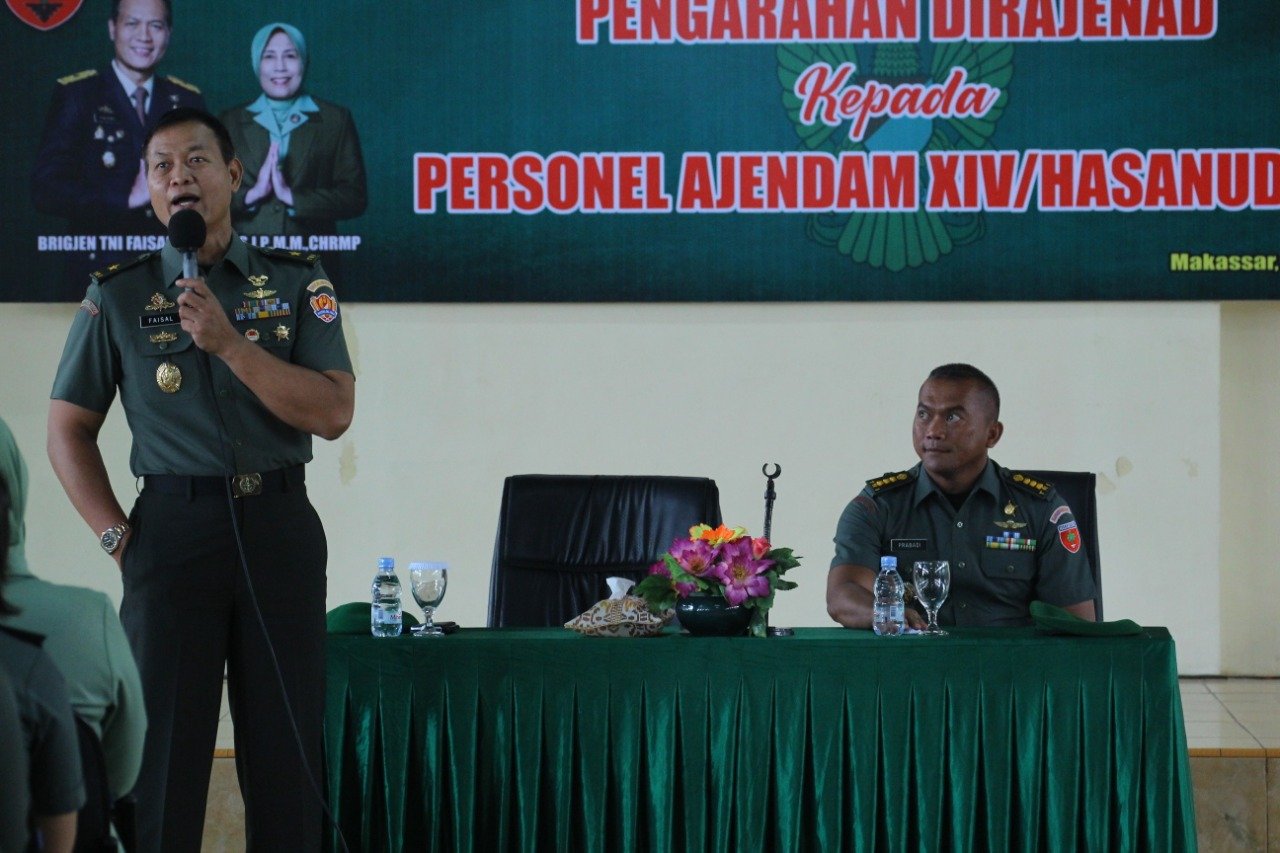 Pada kesempatan ini Brigjen Faisal memberikan pengarahan kepada seluruh personel Ajendam Hasanuddin. Di awal arahannya Dirajenad mengajak untuk mengimplementasikan perintah harian Kasad dan Slogan Ditajenad (Smart, Integritas, Adaptif dan Profesional).