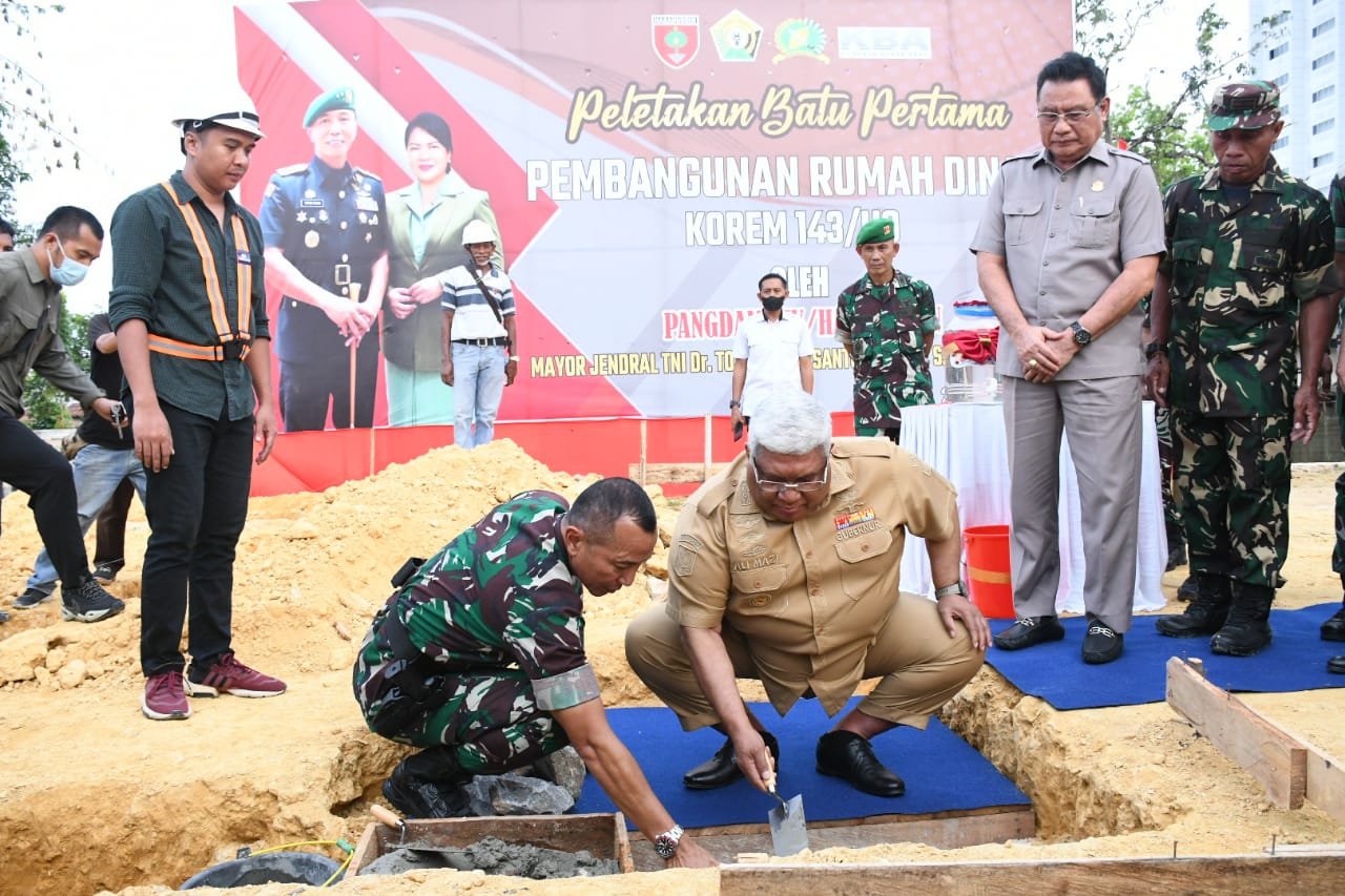 Pangdam XIV/Hasanuddin Mayjen TNI Dr. Totok Imam Santoso, SIP, S.Sos, M.Tr (Han), didampingi sejumlah Pejabat Utama (PJU) Kodam XIV/Hasanuddin beserta unsur Forkopimda Sulawesi Tenggara, melaksanakan peletakan batu pertama pembangunan rumah dinas (Rumdis) Korem 143/Halu Oleo, bertempat di Makorem 143/Halu Oleo, Kendari, Senin (21/11/2022).