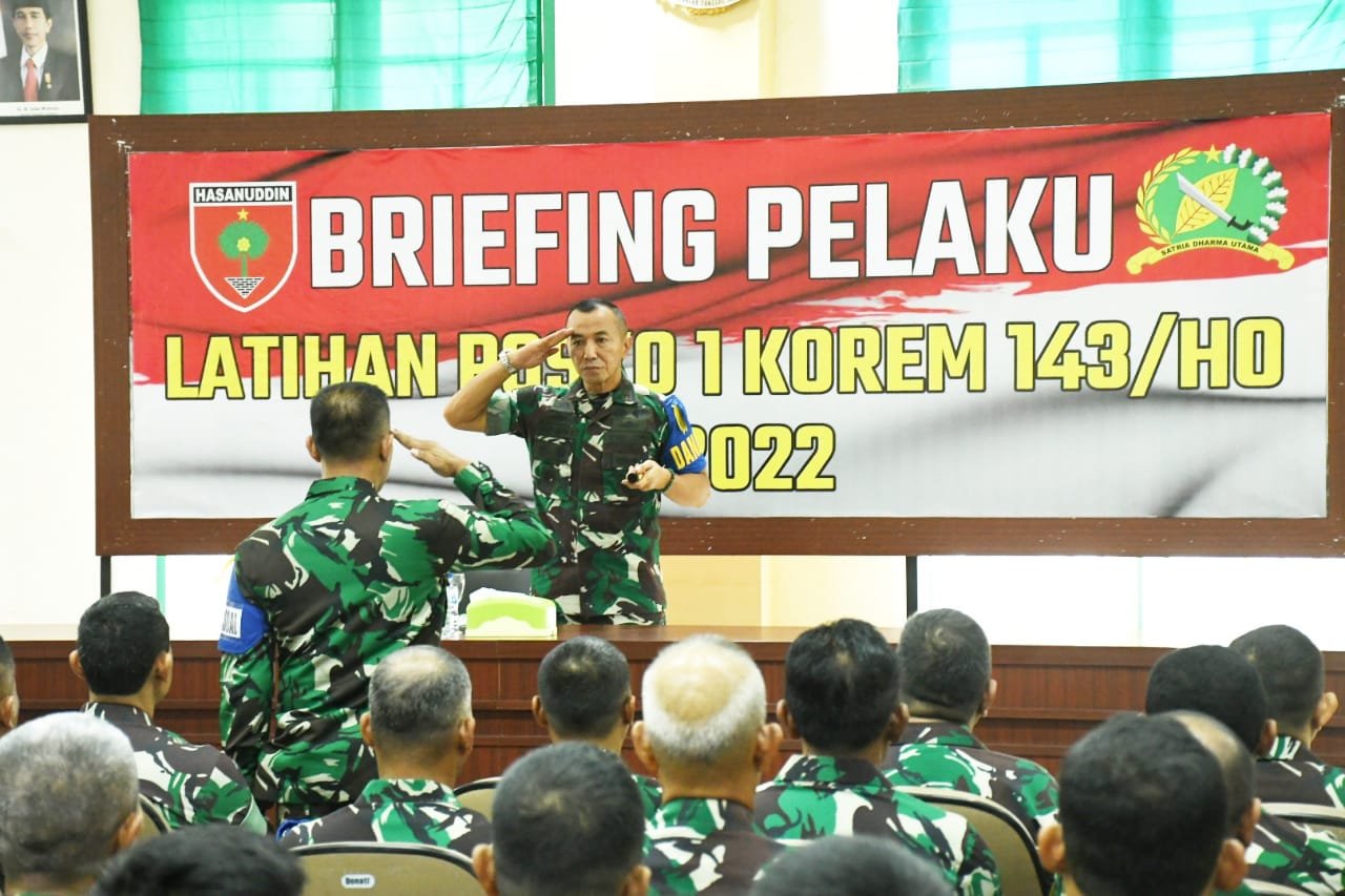 Pangdam XIV/Hasanuddin Mayjen TNI Totok Imam Santoso, SIP, S.Sos, M.Tr (Han) selaku Komandan Latihan (Danlat) memimpin Briefing Awal Latihan Posko I Korem 143/Halu Oleo TA 2022, bertempat di Makorem 143/Halu Oleo Kota Kendari, Rabu (23/11/2022).