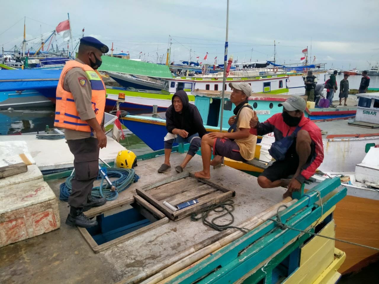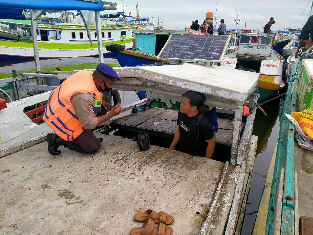 Mengantisipasi cuaca buruk, Satuan Polisi Perairan Polres Pelabuhan Makassar melaksanakan patroli dan sambang sekaligus memberikan imbauan kamtibmas kepada nelayan dan ABK di pelabuhan tradisoinal Paotere Makassar, Rabu (30/11/2022).