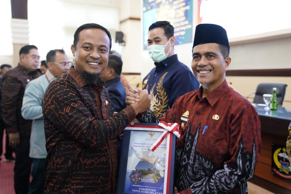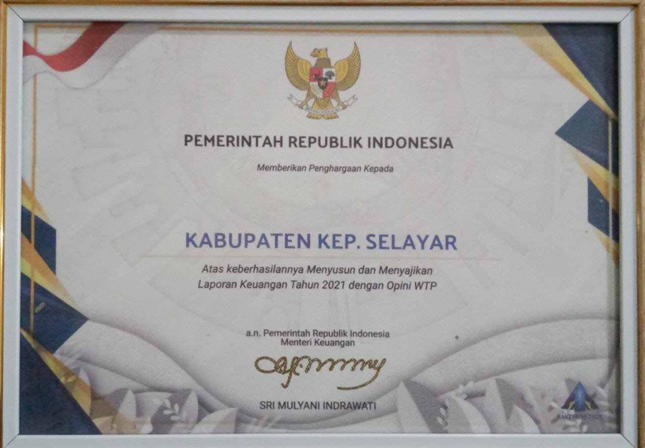 Piagam Penghargaan yang ditandatangani Menteri Keuangan Sri Mulyani atas nama Pemerintah RI diberikan kepada Pemkab Kepulauan Selayar atas keberhasilannya menyusun dan menyajikan laporan keuangan tahun 2021 dengan Opini "Wajar Tanpa Pengecualian"