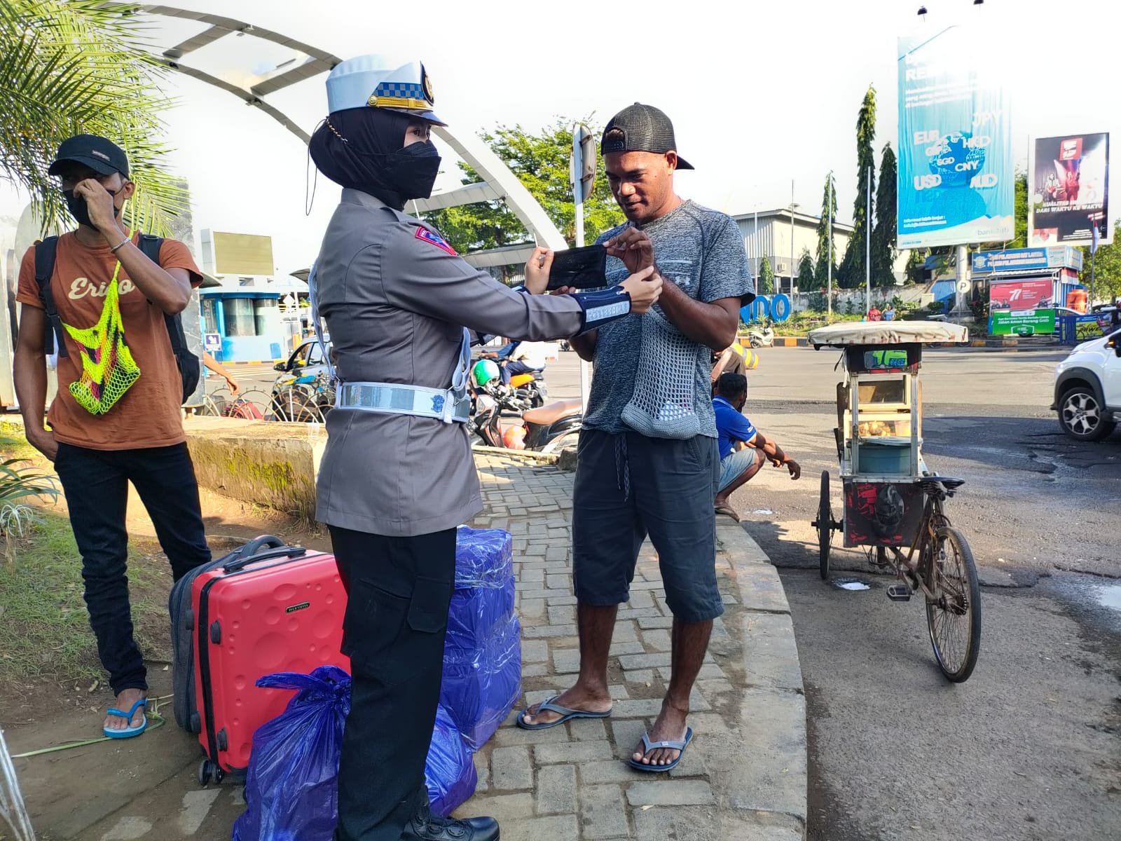 Satlantas Polres Pelabuhan Makassar menyampaikan sosialisasi taat berlalulintas serta membagikan masker kepada masyarakat yang beraktifitas sekitar Pelabuhan Soekarna Hatta Makassar, Jum'at (09/12/2022).