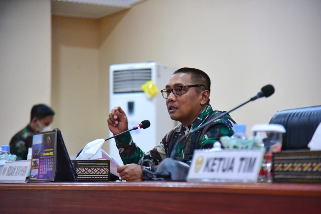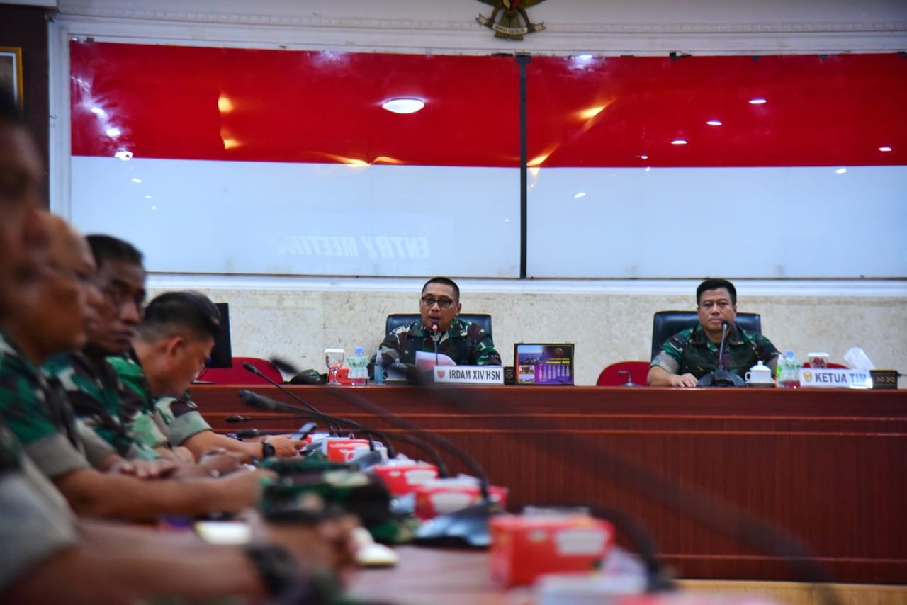 Pangdam XIV/Hasanuddin Mayjen TNI Dr. Totok Imam Santoso, SIP, S.Sos, M.Tr(Han), diwakili oleh Irdam XIV/Hasanuddin Brigjen TNI Dwi Endrosasongko, S.Sos bersama Tim Itjenad melaksanakan exit meeting evaluasi implementasi Sistem Akuntabilitas Kinerja Instansi Pemerintah (SAKIP) Tahun 2022 jajaran Kodam XIV/Hasanuddin, bertempat di Ruang Bina Yudha Makodam, Makassar, Senin (12/12/2022).
