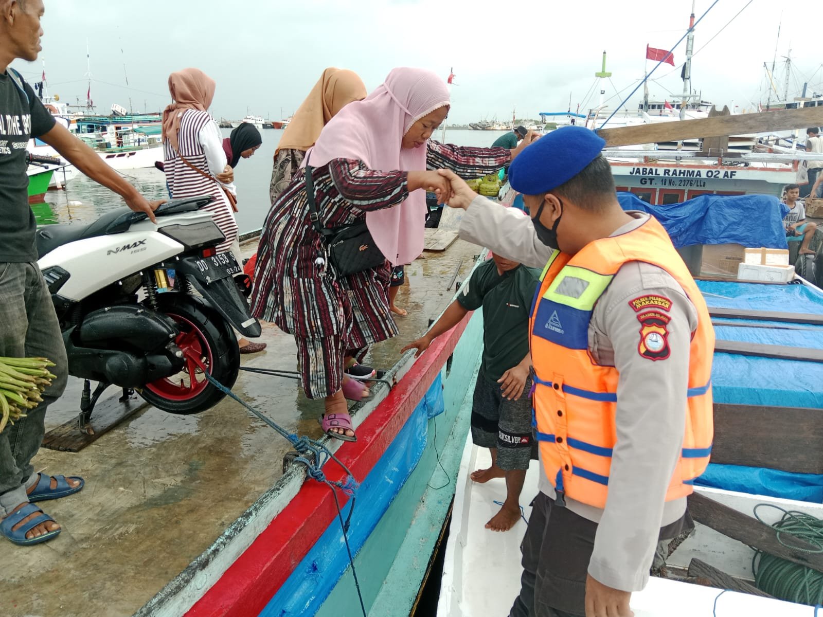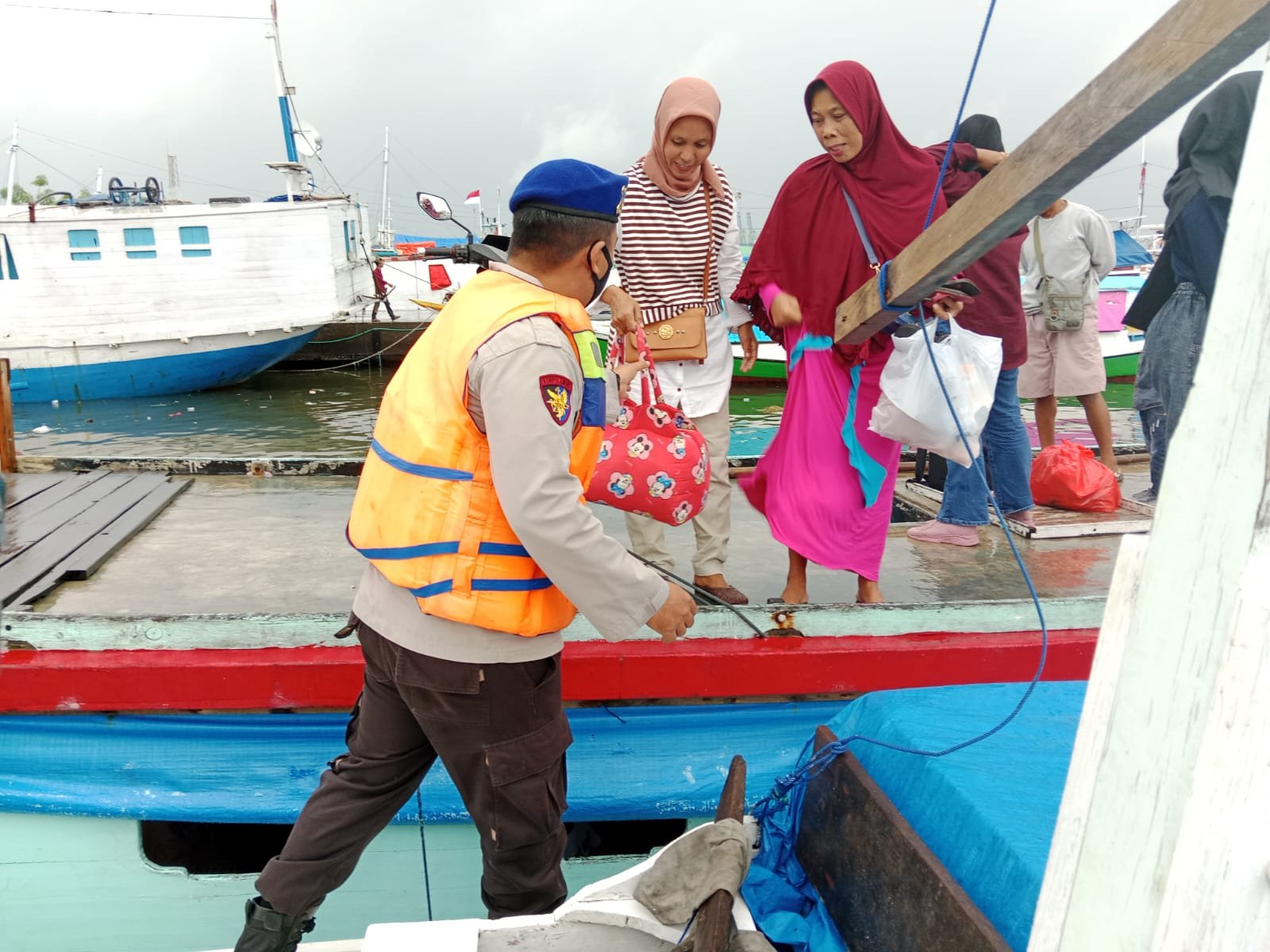 membantu menurunkan penumpang khususnya ibu-ibu dan anak-anak serta barang bawaan para penumpang yang akan turun dari kapal," ucap Kasubsipenmas Sihumas Aipda Adil, Minggu (18/12/2022).