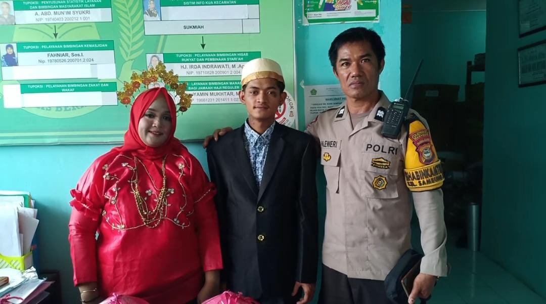 Personel Bhabinkamtibmas Polsek Mamajang Aiptu Paleweri menghadiri pernikahan sepasang remaja A. Farah Reskyani dengan Jadwal di Kantor Urusan Agama (KUA) Kecamatan Mamajang Jalan Kakatua Kota Makassar, Senin (19/12/2022).