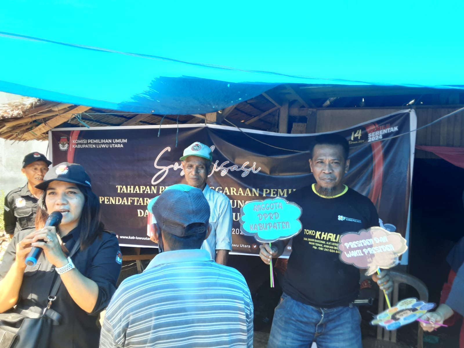 KPU Luwu Utara menyambangi Pasar Tarue guna melakukan sosialisasi tahapan pendaftaran Panitia Penyelenggara pemilu tentang Pemilu serentak 17 April mendatang yang bertujuan untuk meningkatkan partisipasi pemilih dan pemahaman kepemiluan.