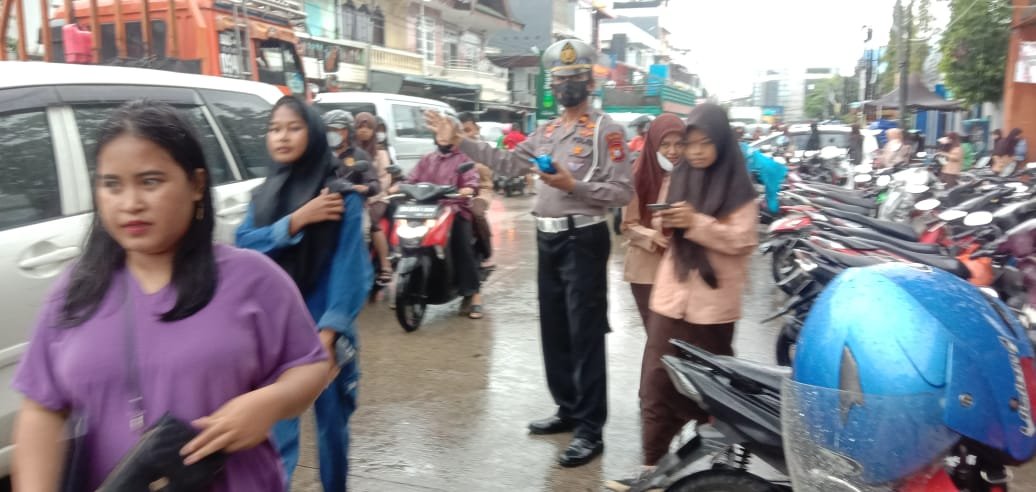 Unit Lantas Polsek Ujung Tanah Polres Pelabuhan Makassar melakukan pengaturan kendaraan di jam pulang sekolah dalam wilayah hukumnya, Jum'at (23/12/2022).