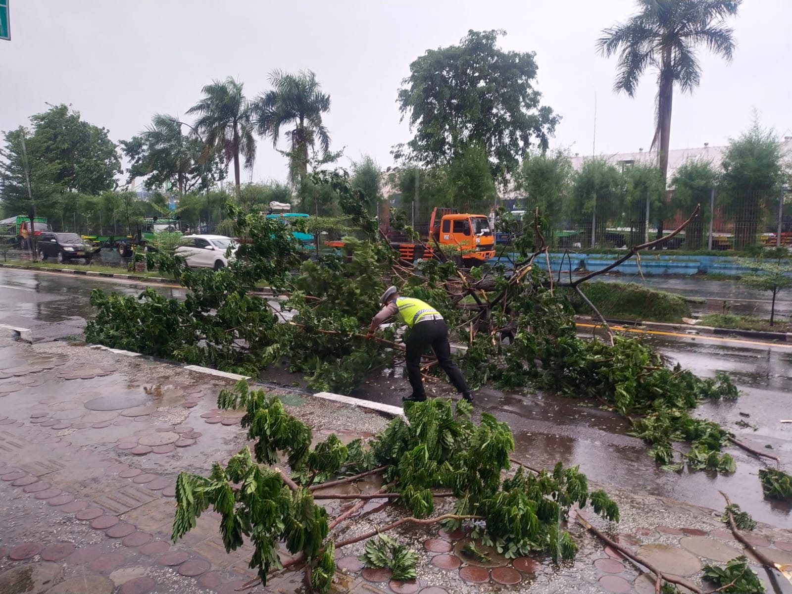 "Pohon yang tumbang tersebut sempat menutup sebagian badan jalan Nusantara serta membuat arus lalu lintas kendaraan yang melintas di jalan sedikit terganggu dan menimbulkan kemacetan," ucap Kasubsipenmas Sihumas Aipda Adil, Minggu (25/12/2022).