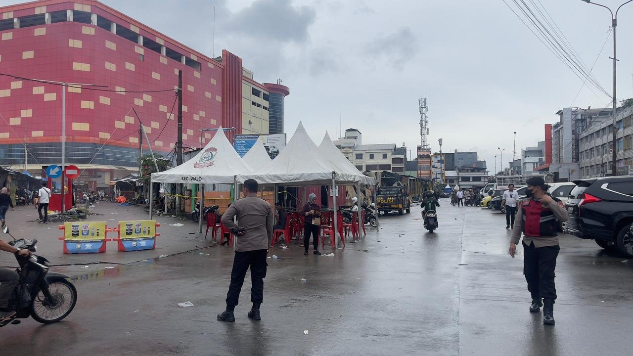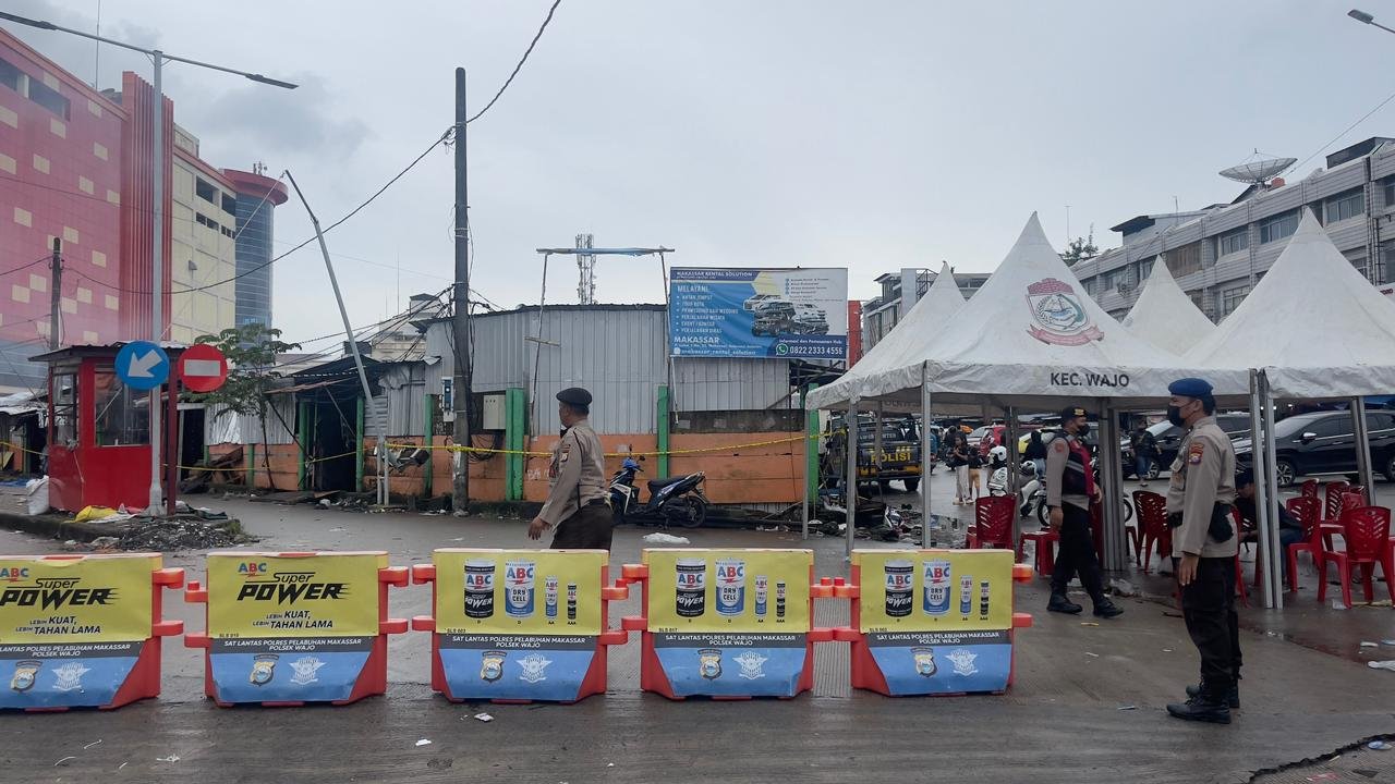 Polres Pelabuhan Makassar terus melakukan penjagaan dan pemantauan di sekitar lokasi pasar sentral yang terbakar, Rabu (28/12/2022).