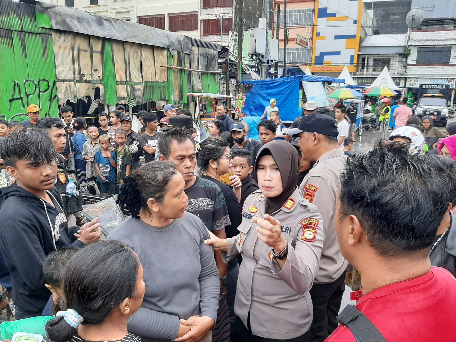 "Dipimpin Kasat Binmas AKP Kasmawati, personel Satbinmas Polres Pelabuhan Makassar melaksanakan kegiatan Public Address sekitar Pasar Sentral Makassar pasca kebakaran dengan materi imbauan kamtibmas kepada masyarakat," ucap Kasubsipenmas Sihumas Aipda Adil.