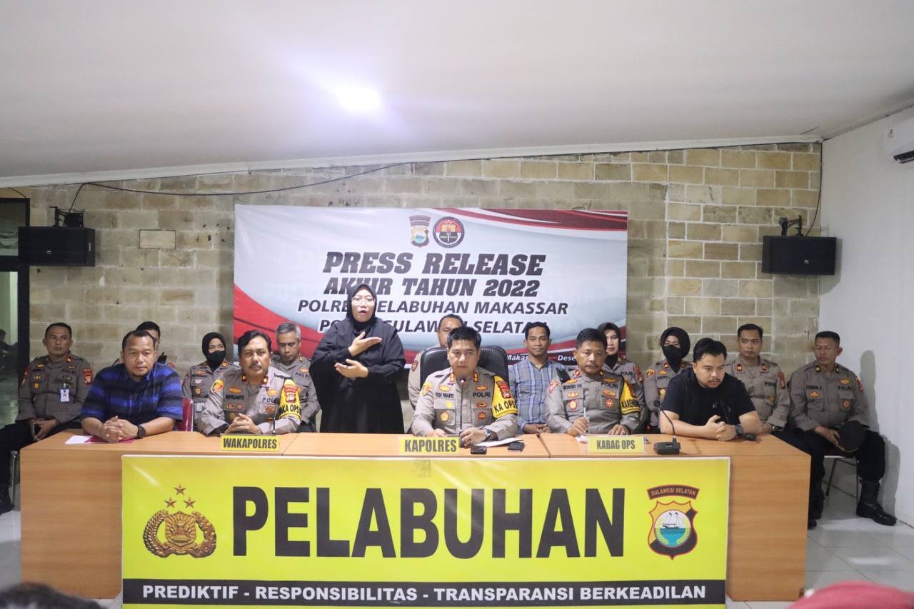 Kepala Kepolisian Resor (Kapolres) Pelabuhan Makassar, AKBP Yudi Frianto menggelar rilis akhir tahun 2022 di Mapolres Pelabuhan Makassar, Jumat (30/12/2022) sore.