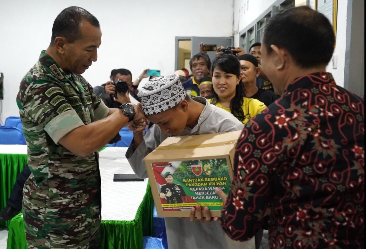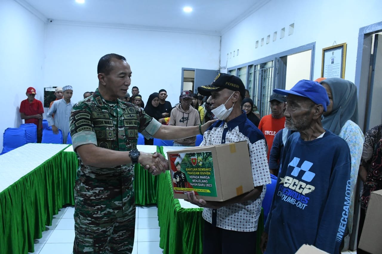 Pangdam XIV/Hasanuddin Mayjen TNI Dr. Totok Imam Santoso, SIP, S.Sos, M.Tr.(Han) bersama sejumlah Pejabat Utama (PJU) Kodam XIV/Hasanuddin menyerahkan bantuan sosial (bansos) kepada warga sekitar, bertempat di Puskopad Kartika Hasanuddin, Makassar, Jumat (30/12/2022).
