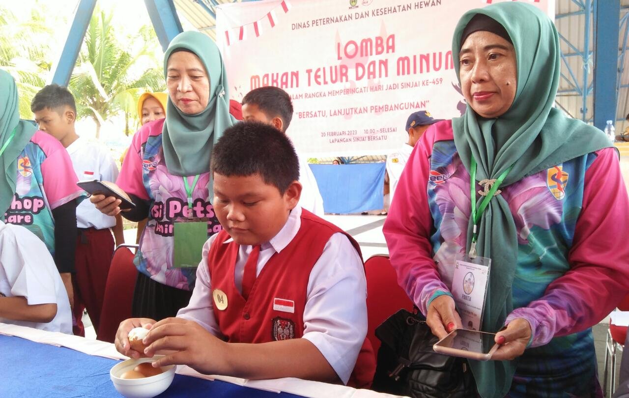 Puluhan pelajar SD dan SMP di Kabupaten Sinjai tampak antusias mengikuti lomba makan telur dan minum susu yang berlangsung di Tribun Utama Lapangan Sinjai Bersatu, Senin (20/02/2023).