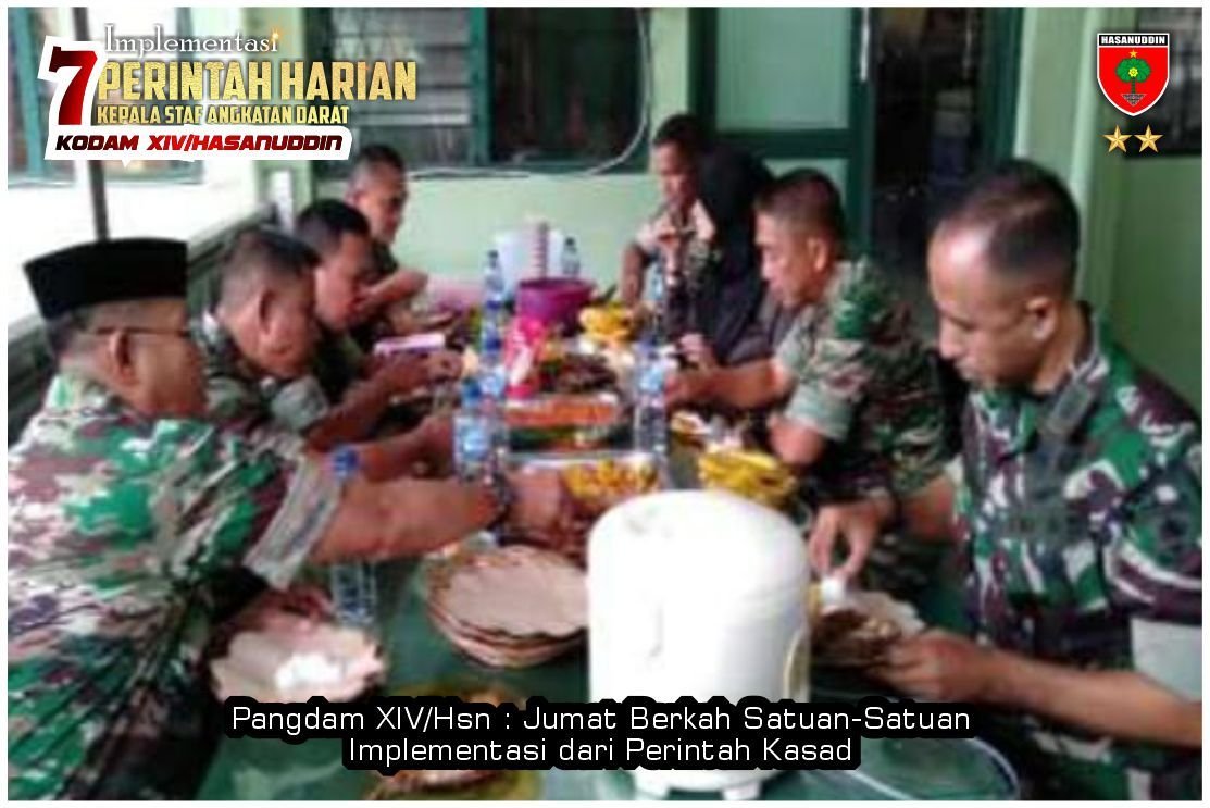 "Selain untuk mempererat hubungan kekeluargaan, hal ini juga sejalan dengan perintah harian Kasad serta dituangkan dalam perintah program unggulan Pangdam XIV/Hasanuddin yaitu melaksanakan kegiatan Jumat berkah secara rutin," ungkapnya.