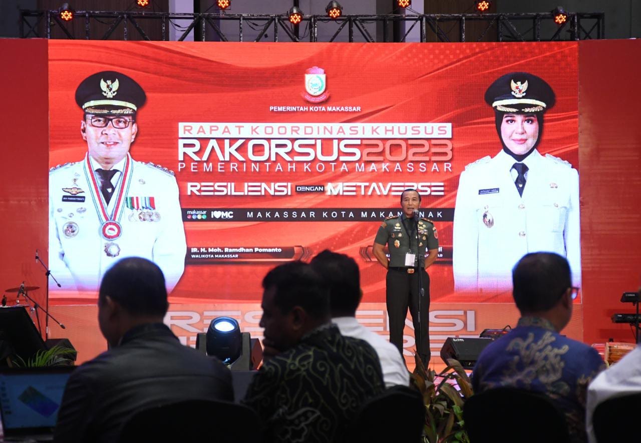 Pangdam XIV/Hasanuddin Mayjen TNI Dr. Totok Imam Santoso, SIP, S.Sos, M.Tr(Han) didampingi sejumlah Pejabat Utama (PJU) Kodam XIV/Hasanuddin menghadiri Rapat Kordinasi Khusus (Rakorsus) tahun 2023, yang digelar oleh Pemeritah Kota Makassar dengan mengusung tema “Makassar Kota Resiliensi dengan Metaverse”, bertempat di Hotel Four Point by Sheraton, Kota Makassar, Selasa (14/03/2023).