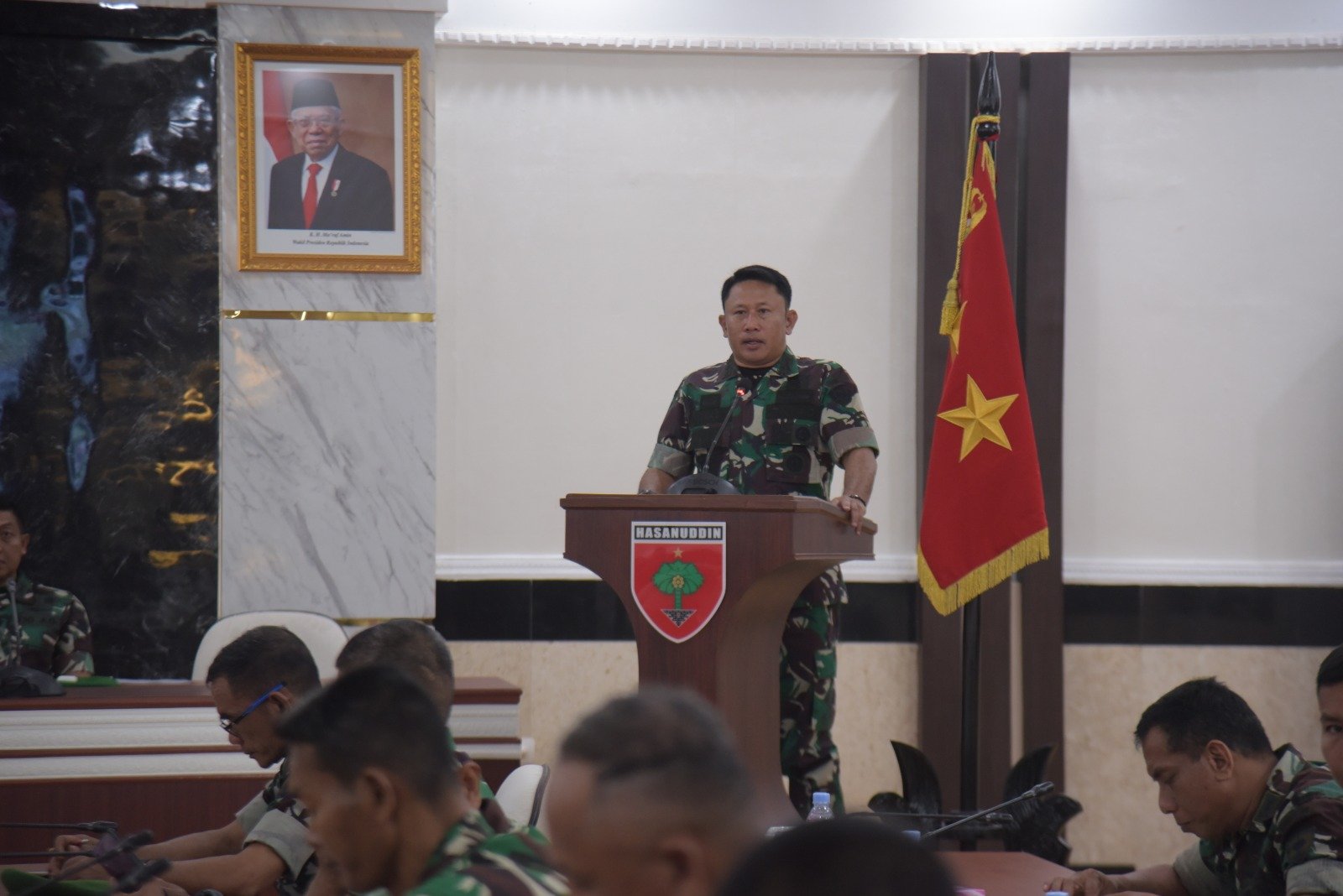 Kodam XIV/Hasanuddin menggelar sosialisasi program Bakti TNI TA 2023 melalui tatap muka dengan pejabat Teritorial Balakdam yang berada di wilayah Kota Makassar dan melalui video conference (vicon) dengan pejabat Teritorial yang berada di wilayah jajaran Kodam XIV/Hasanuddin, Senin (13/03/2023).