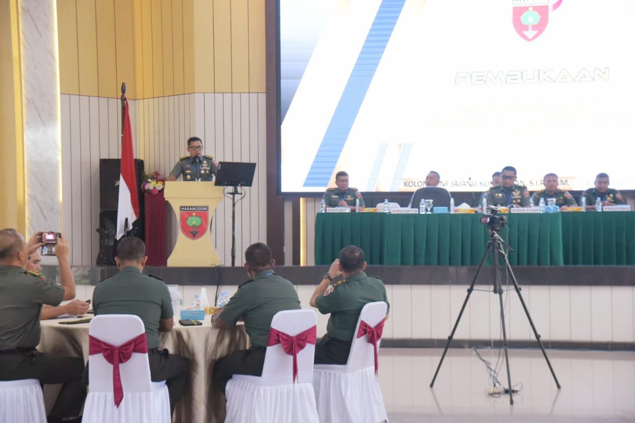 Asisten Personel (Aspers) Kasdam XIV/Hasanuddin Kolonel Inf Jajang Kurniawan, SIP, MM memimpin Rapat Kerja Teknis (Rakernis) Bidang Personel TA 2023, bertempat di Balai Pertemuan Hasanuddin Makodam, Kota Makassar, Rabu (15/03/2023).