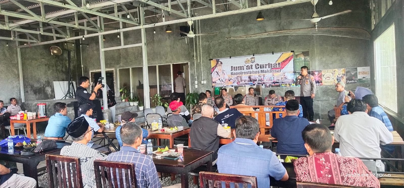 Wakapolrestabes Makassar AKBP Budi Susanto, SIK, didampingi Kapolsek Manggala Kompol H. Syamsuardi, S.Sos, MH menggelar “Jumat Curhat” bersama Tripika Manggala serta warga Kecamatan Manggala di Warkop Fourty Four Jalan Perumnas Raya Antang, Kelurahan Manggala, Kecamatan Manggala, Kota Makassar, Jumat (17/03/2023) pagi.