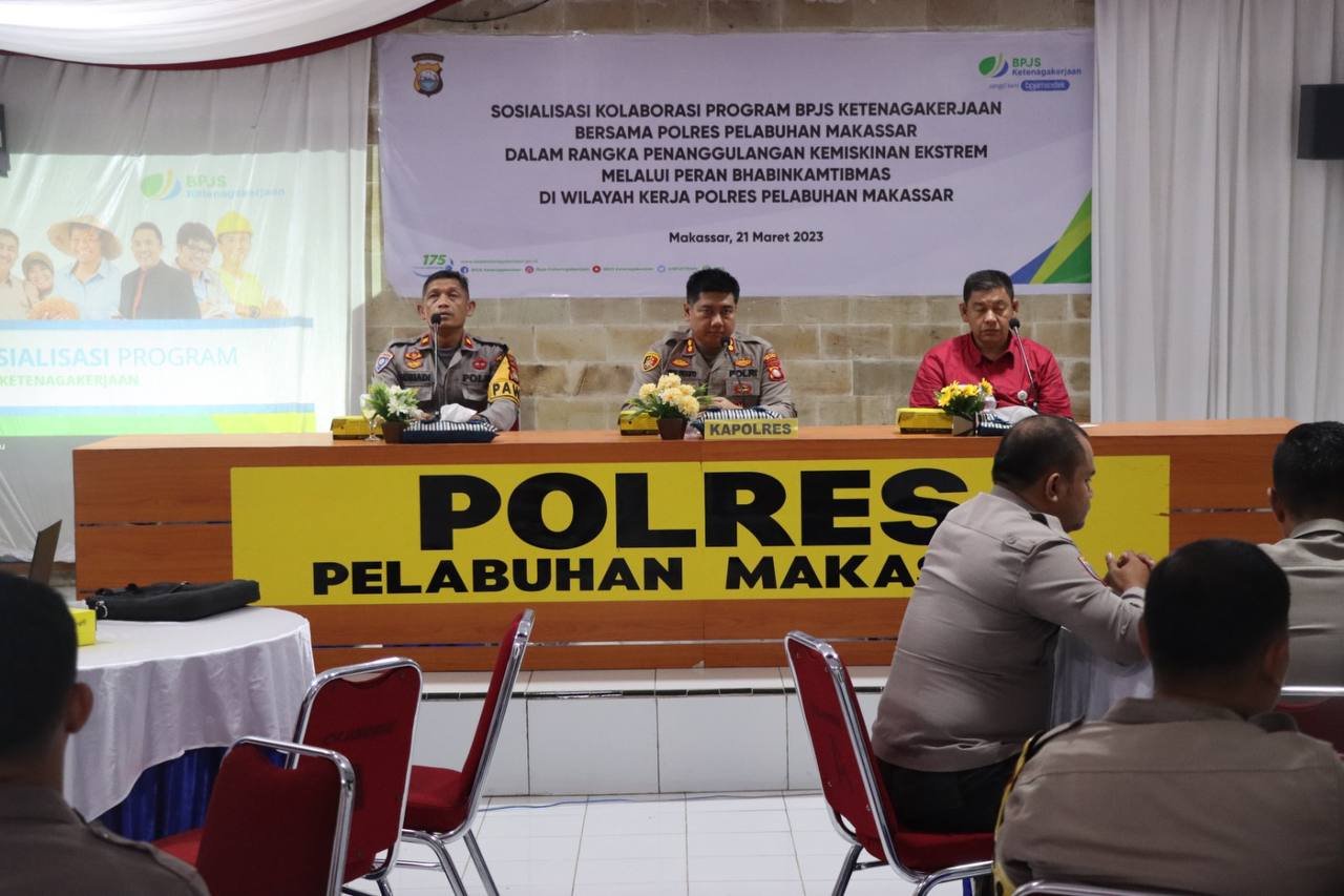 Kepolisian Resor Pelabuhan Makassar bekerjasama dengan BPJS Ketenagakerjaan menyelenggarakan sosialisasi terkait manfaat BPJamsostek, Selasa (21/03/2023).