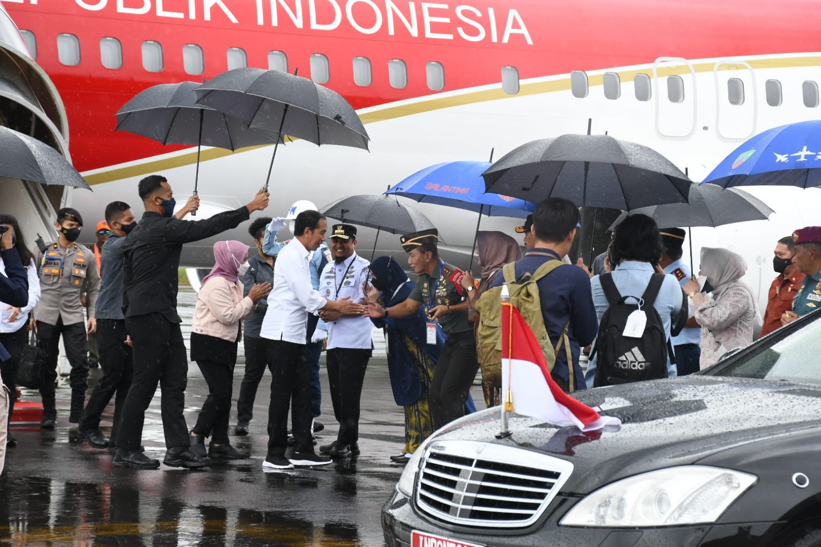 Pangdam XIV/Hasanuddin Mayjen TNI Dr. Totok Imam Santoso, SIP, S.Sos, M.Tr(Han) didampingi Ketua Persit Kartika Chandra Kirana (KCK) Daerah XIV Hasanuddin Ny. Desi Totok Imam bersama Forkopimda Provinsi Sulsel, menyambut kedatangan Presiden RI Joko Widodo dan Ibu Iriana Joko Widodo untuk melakukan kunjungan kerja di Provinsi Sulawesi Selatan, Rabu (29/03/2023).