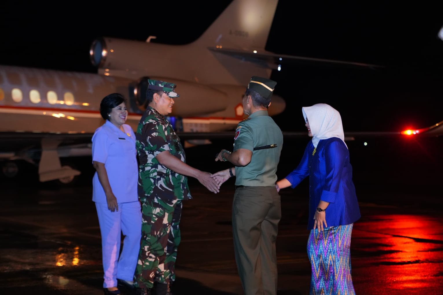 Pangdam XIV/Hasanuddin Mayjen TNI Dr. Totok Imam Santoso, SIP, S.Sos, M.Tr(Han) didampingi Ketua Persit Kartika Chandra Kirana (KCK) Daerah XIV Hasanuddin Ny. Desi Totok Imam, menyambut kedatangan Panglima TNI Laksamana TNI Yudo Margono, SE, MM, CSFA beserta Ny. Veronica Yudo Margono, di Bandara Internasional Sultan Hasanuddin, Kabupaten Maros, Kamis (30/03/2023).